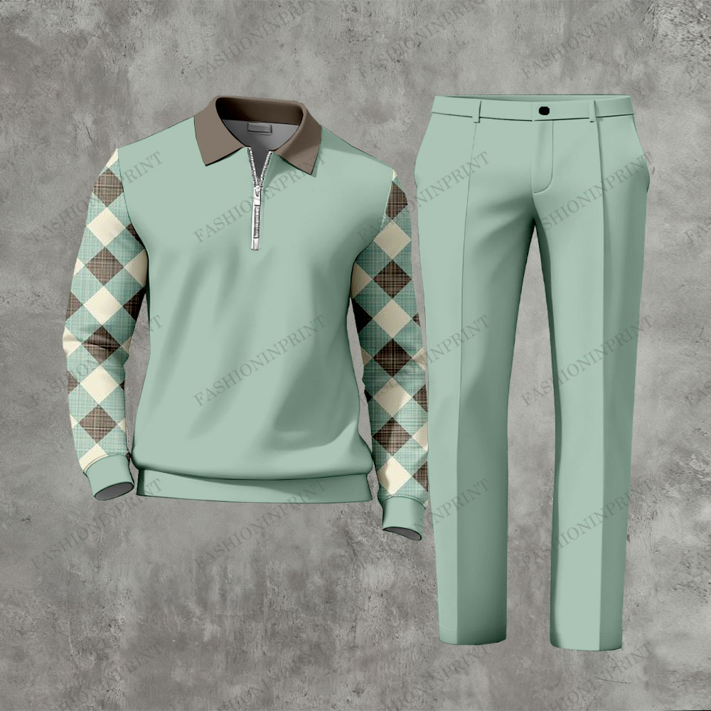 Men's Casual Green & Brown Color Matching Checkered Printed Zipper Long Sleeved Polo Shirt & Trousers Two-Piece Set