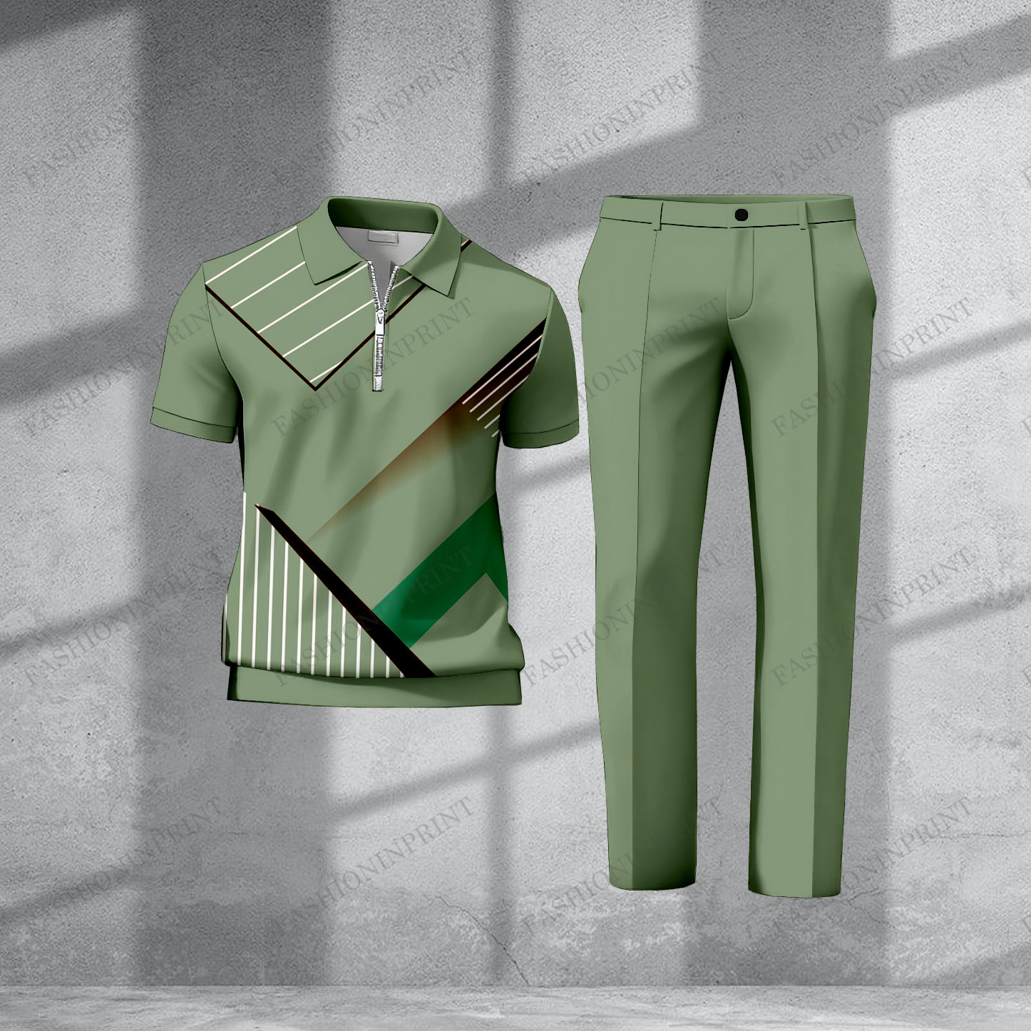 Men's Casual Green Color Matching Geometric Printed Short Sleeved Zipper Polo Shirt & Trousers Two-Piece Set