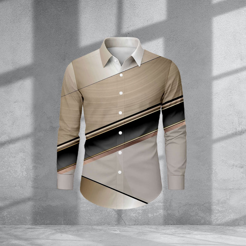 Men's Casual Khaki & Black Color Matching Geometric Print Long-Sleeve Shirt