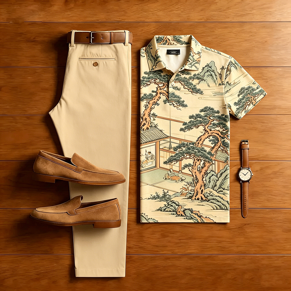 Men's Casual Khaki Landscape Printed Short-Sleeve Polo Shirt And Trousers Two-Piece Set