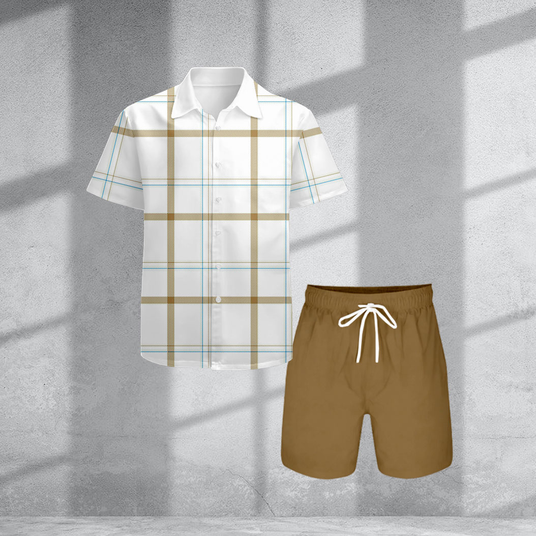 Men's Casual Khaki & White Color Matching Checket Print Short-Sleeve Shirt & Shorts Two-Piece Set