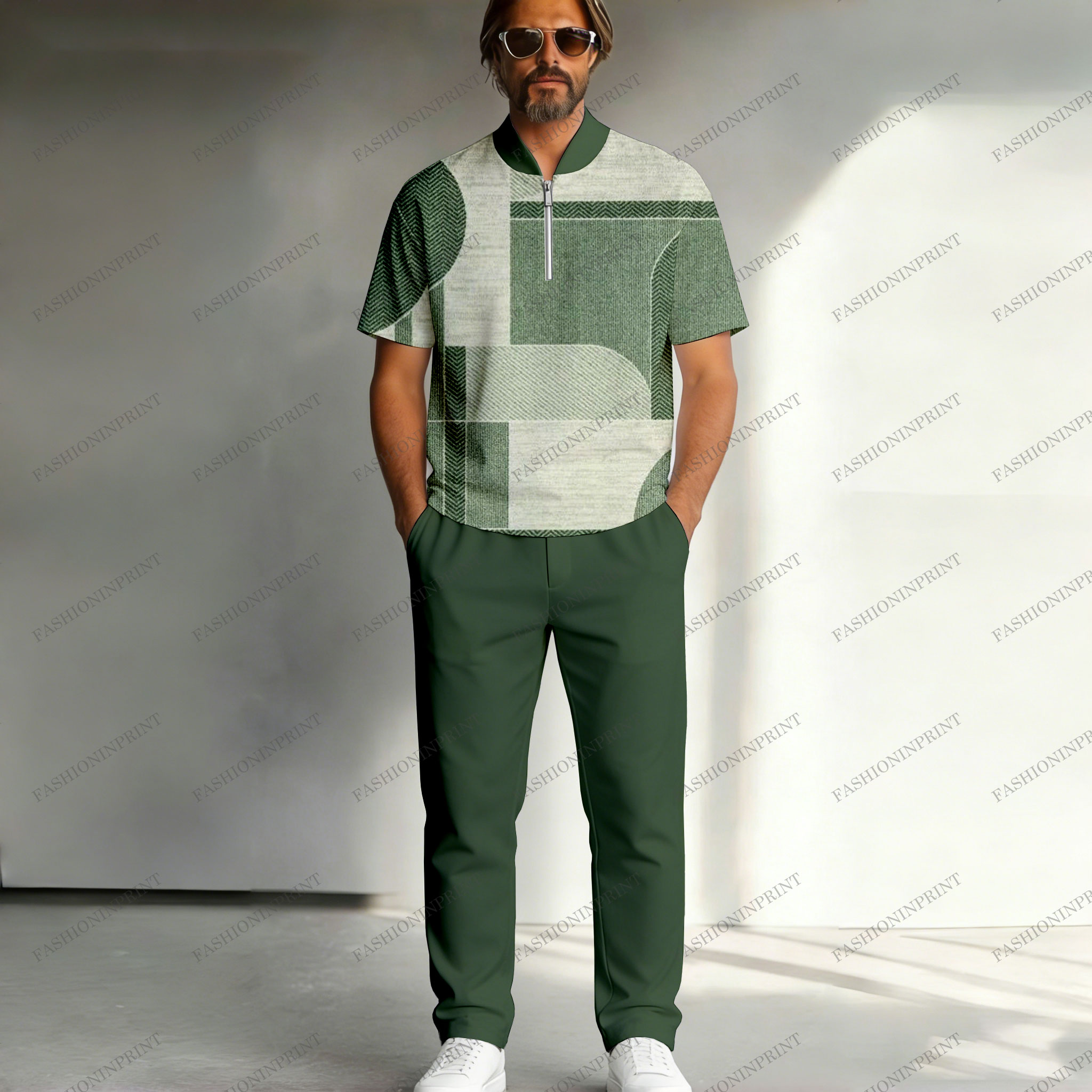 Men's Casual Mulit Green Color Matching Geometric Printed Short Sleeved Zipper Polo Shirt & Trousers Two-Piece Set