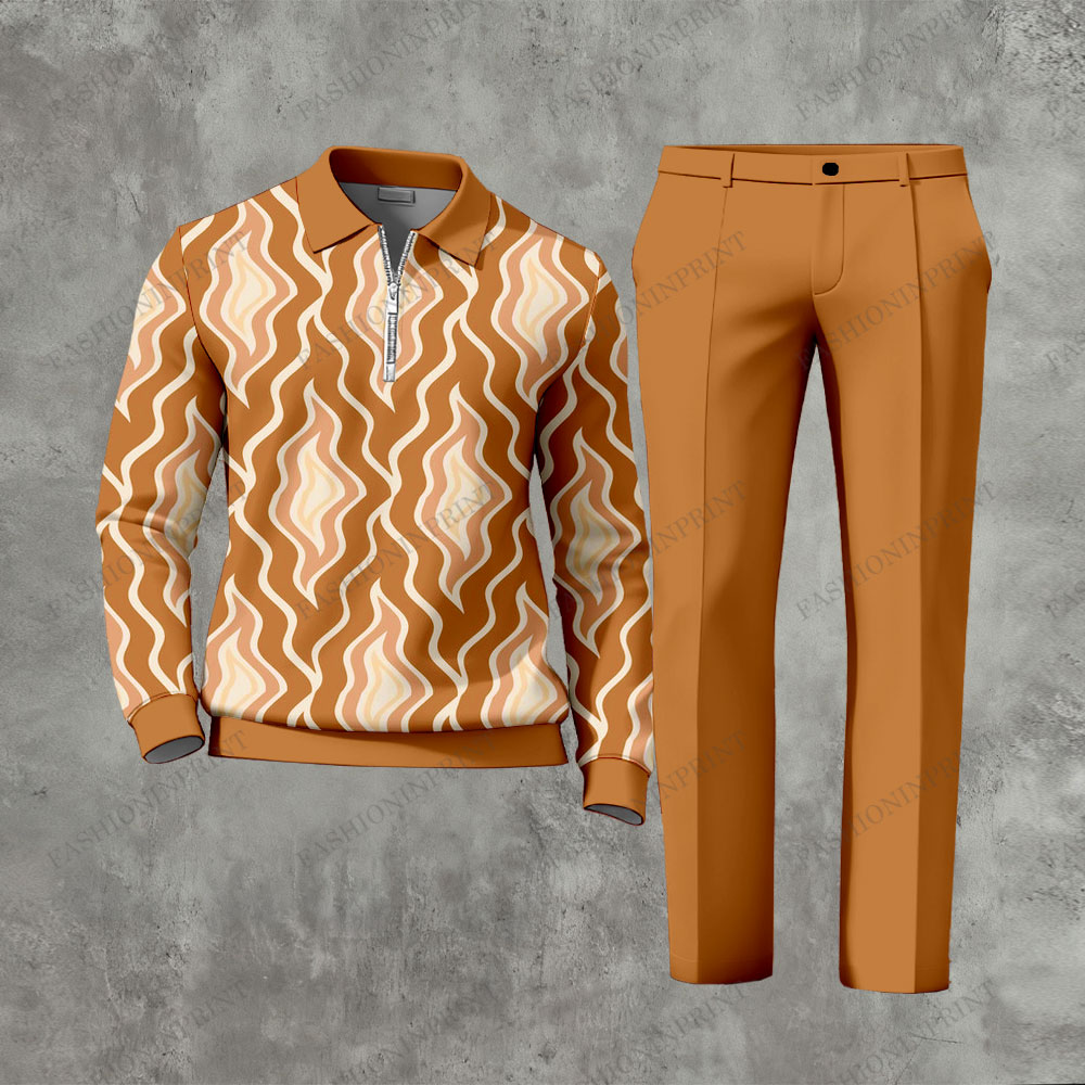 Men's Casual Orange Color Matching Printed Zipper Long Sleeved Polo Shirt & Trousers Two-Piece Set