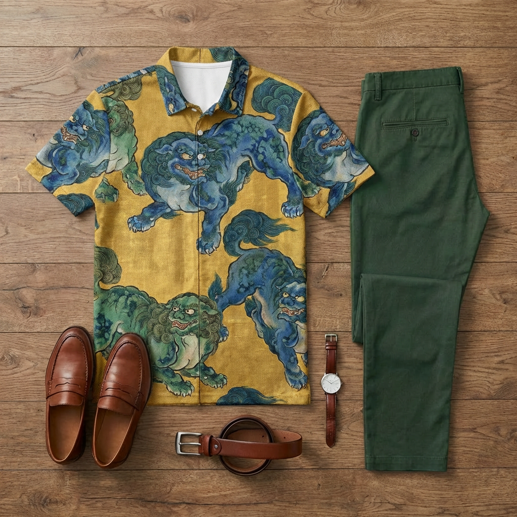Men's Casual Khaki & Blue Printed Short-Sleeve Polo Shirt And Trousers Two-Piece Set