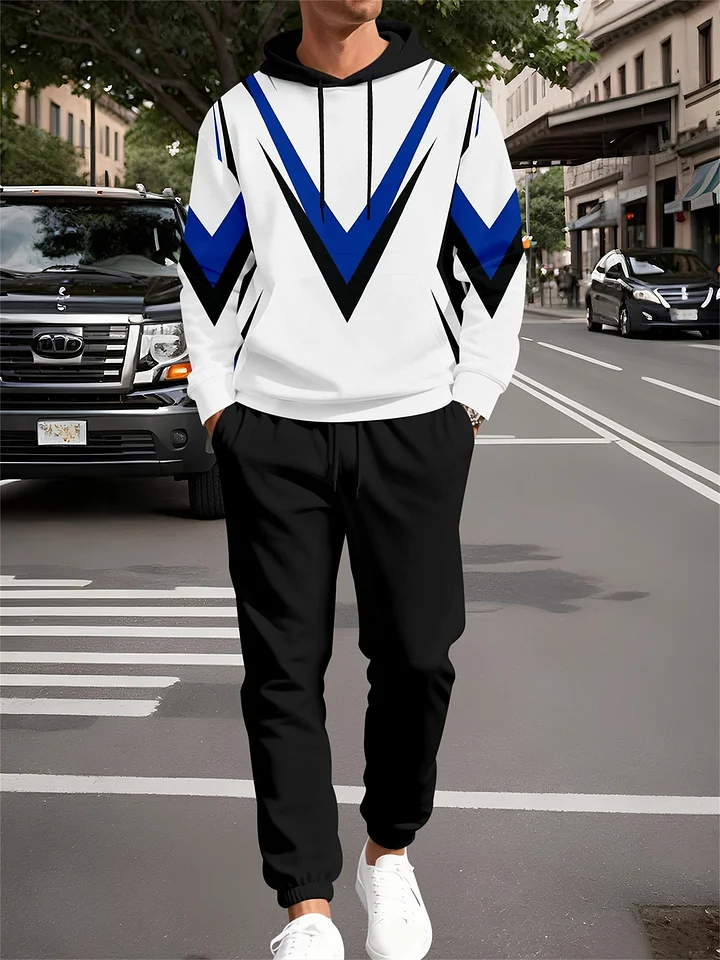 Men's Casual White&Black Color Matching Printed Hoodies Long Sleeved Trousers Two-Piece Set