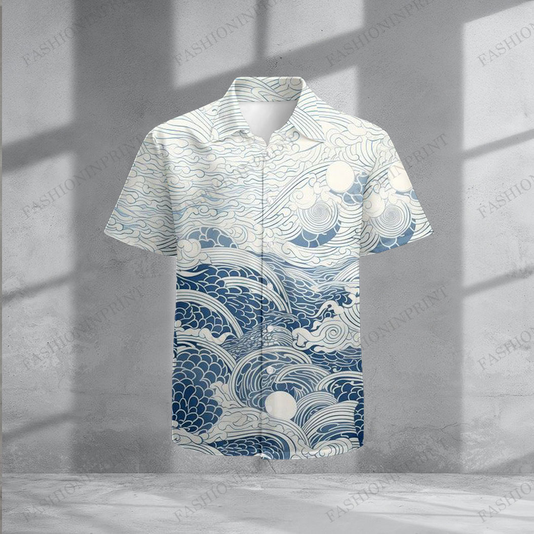 Men's Casual White Waves Color Matching Geometric Print Short-Sleeve Shirt