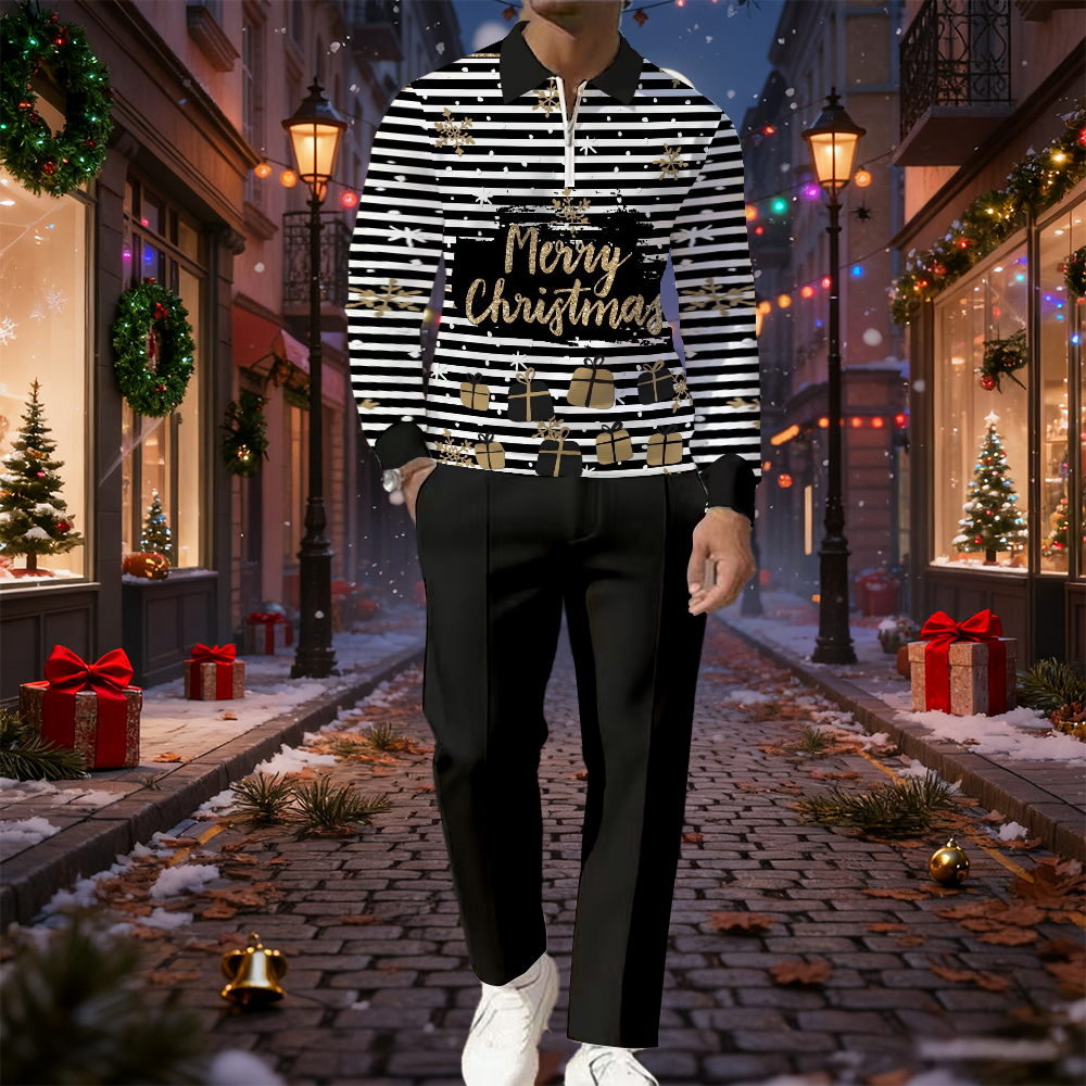 Men's Christmas Color Matching Printed Polo-Collar Zipper Long Sleeved Trousers Two-Piece Set
