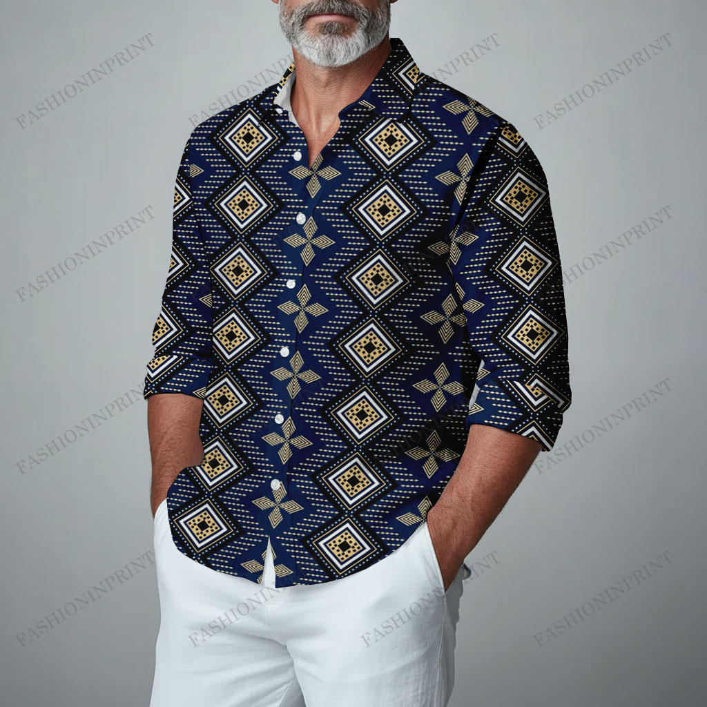 Men's Navy Blue Floral Ethnic Style Pattern Long-Sleeved Shirts Tops