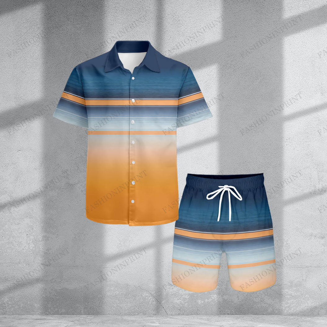 Men's Stylish Orange Striped Print Short-Sleeved Shirt And Shorts Two-Piece Set
