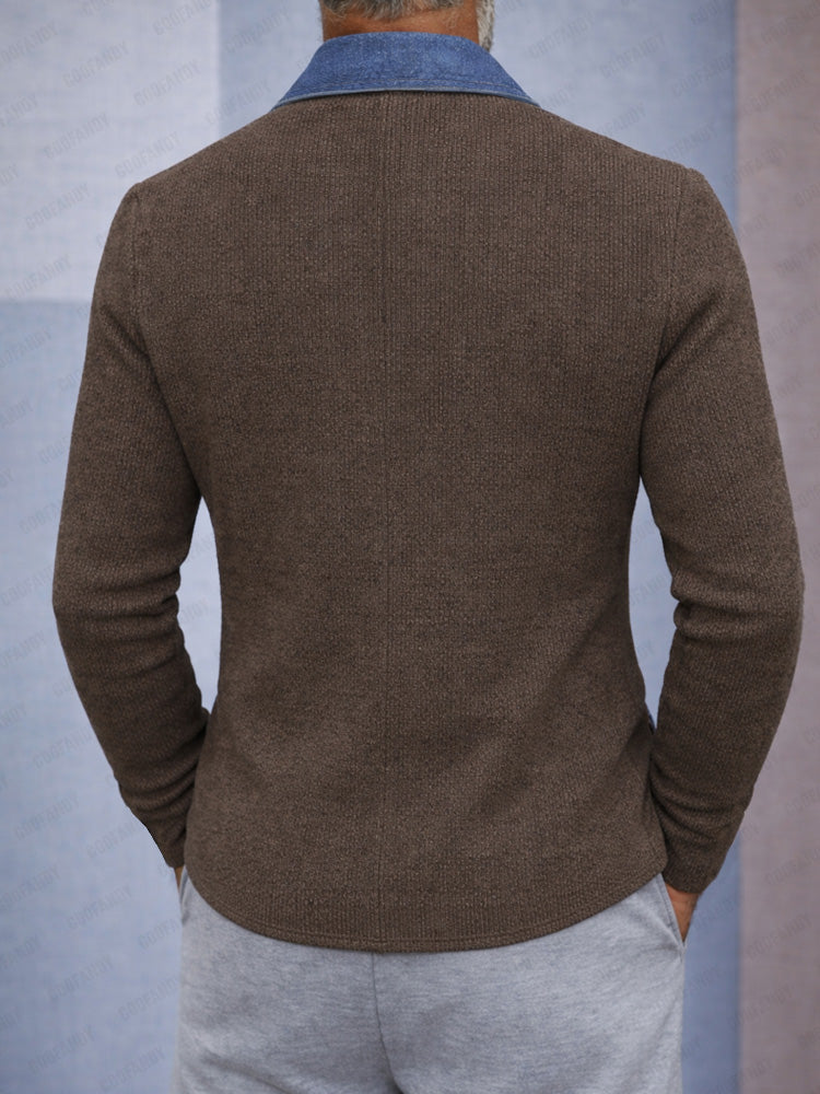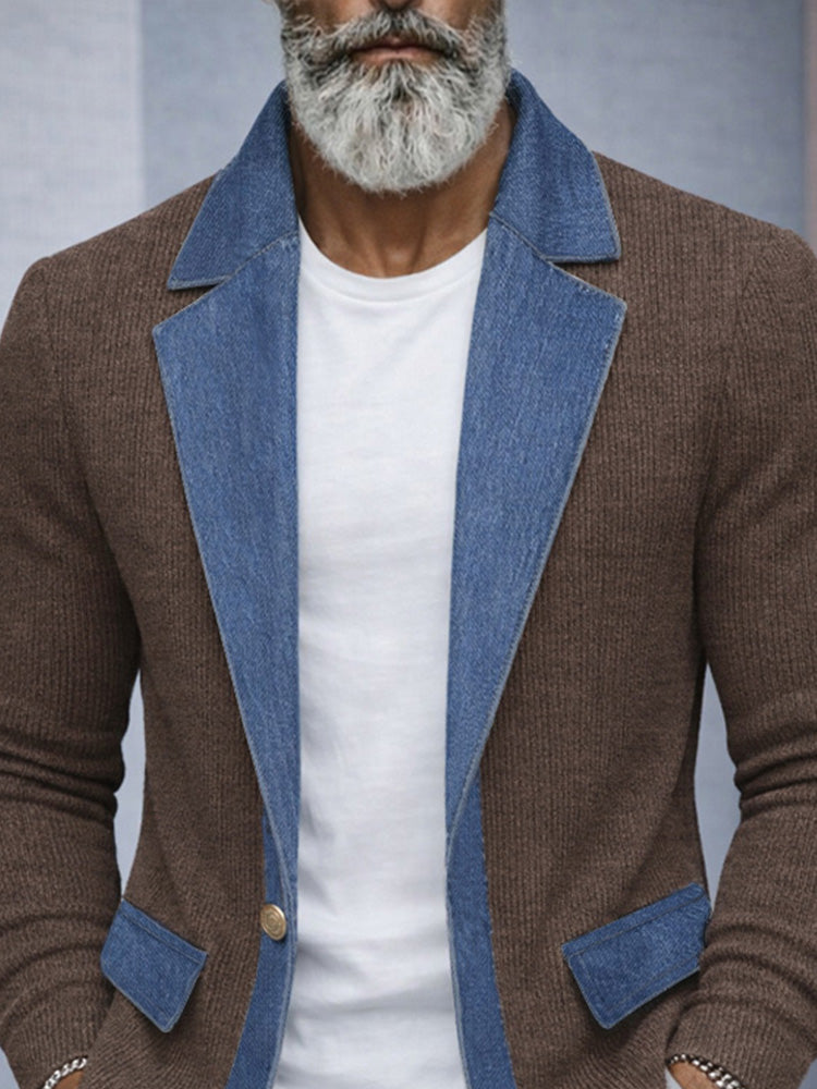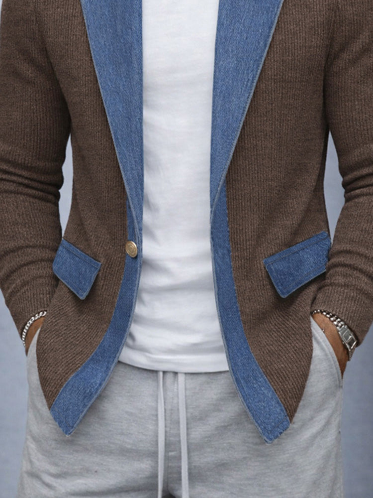 • Design: Comfort knit fabric, faux denim patchwork design, one-button closure