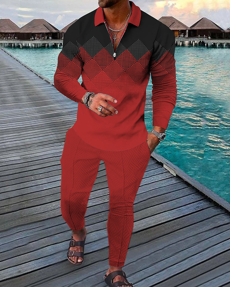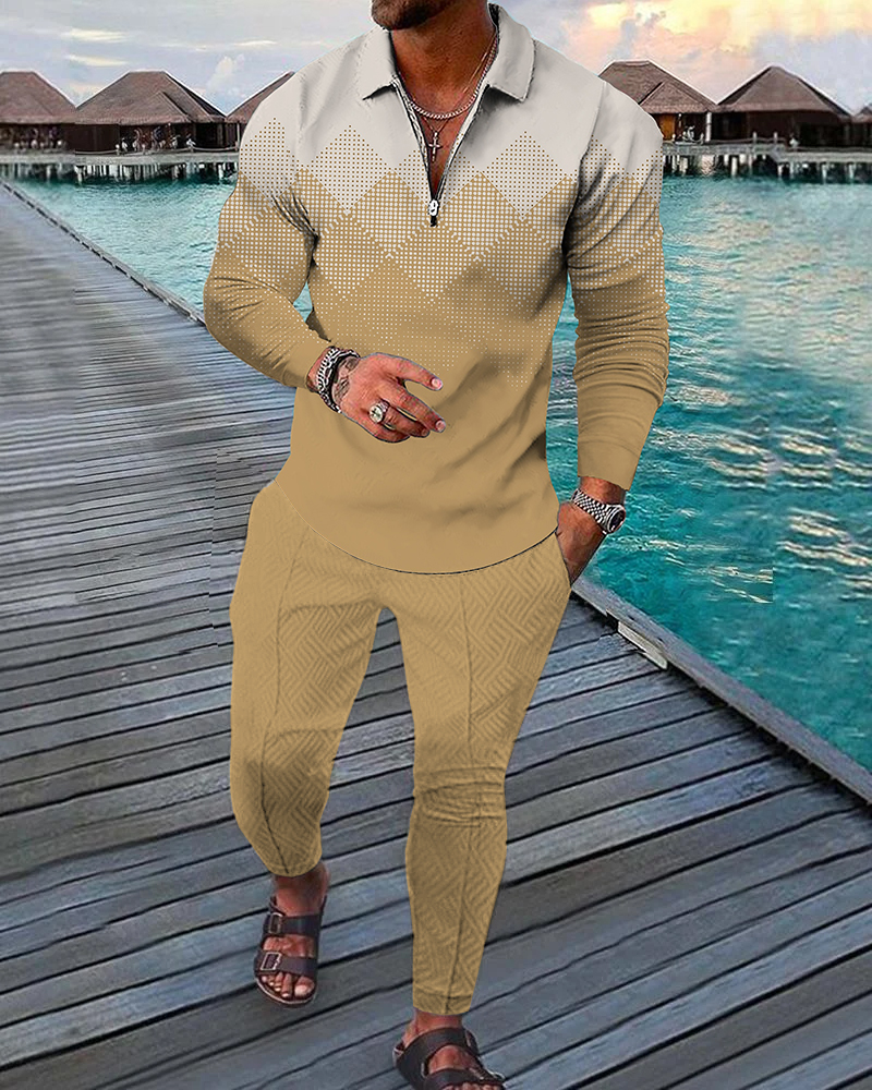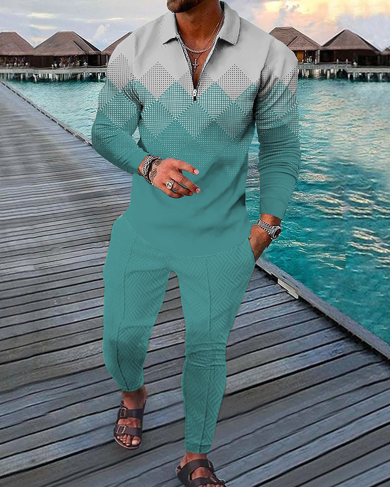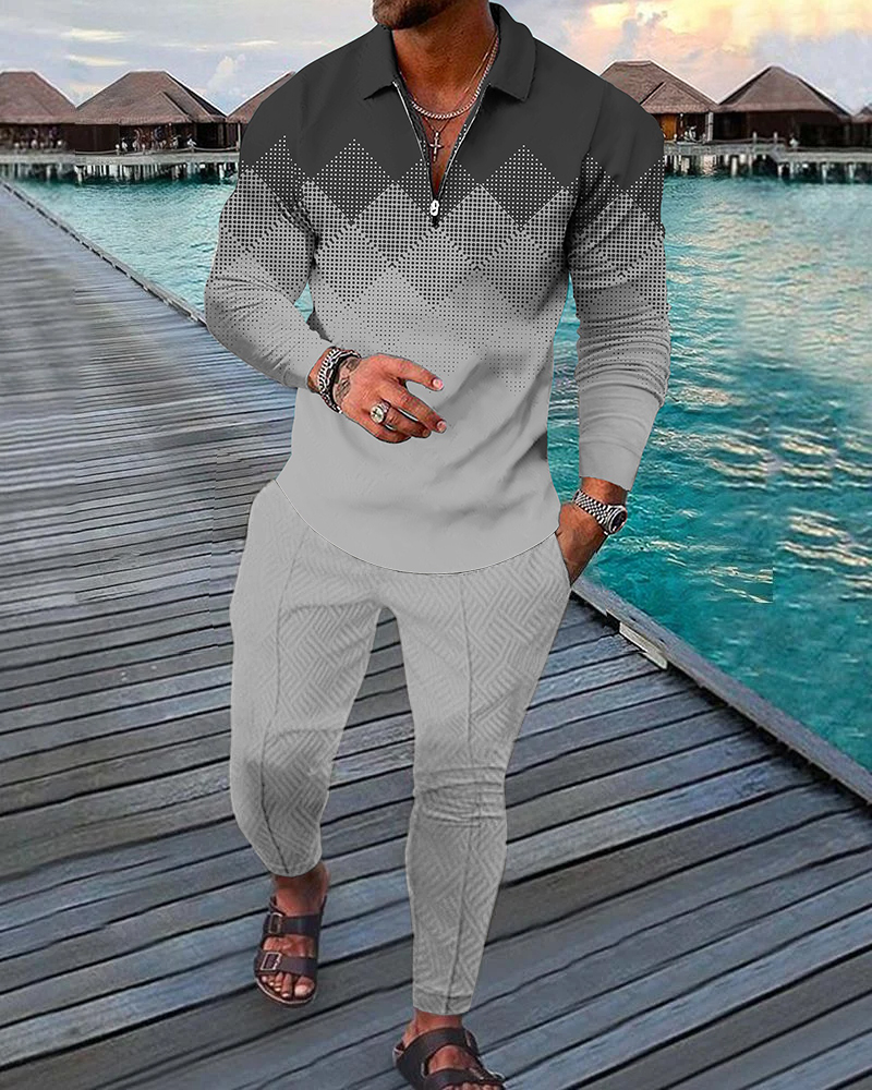 Suitmens Men's Gradient Geometry Long Sleeve Zipped POLO Trousers Set 0292