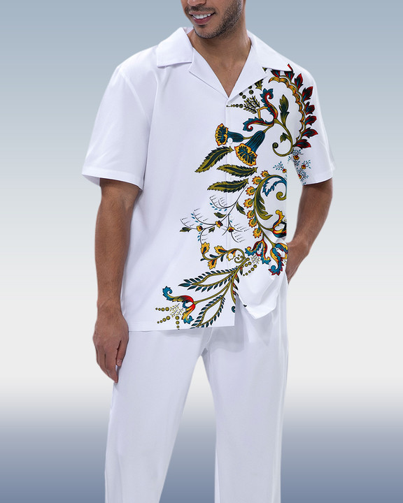 Suitmens Men's White Printed Short Sleeve Shirt Walking Set 277