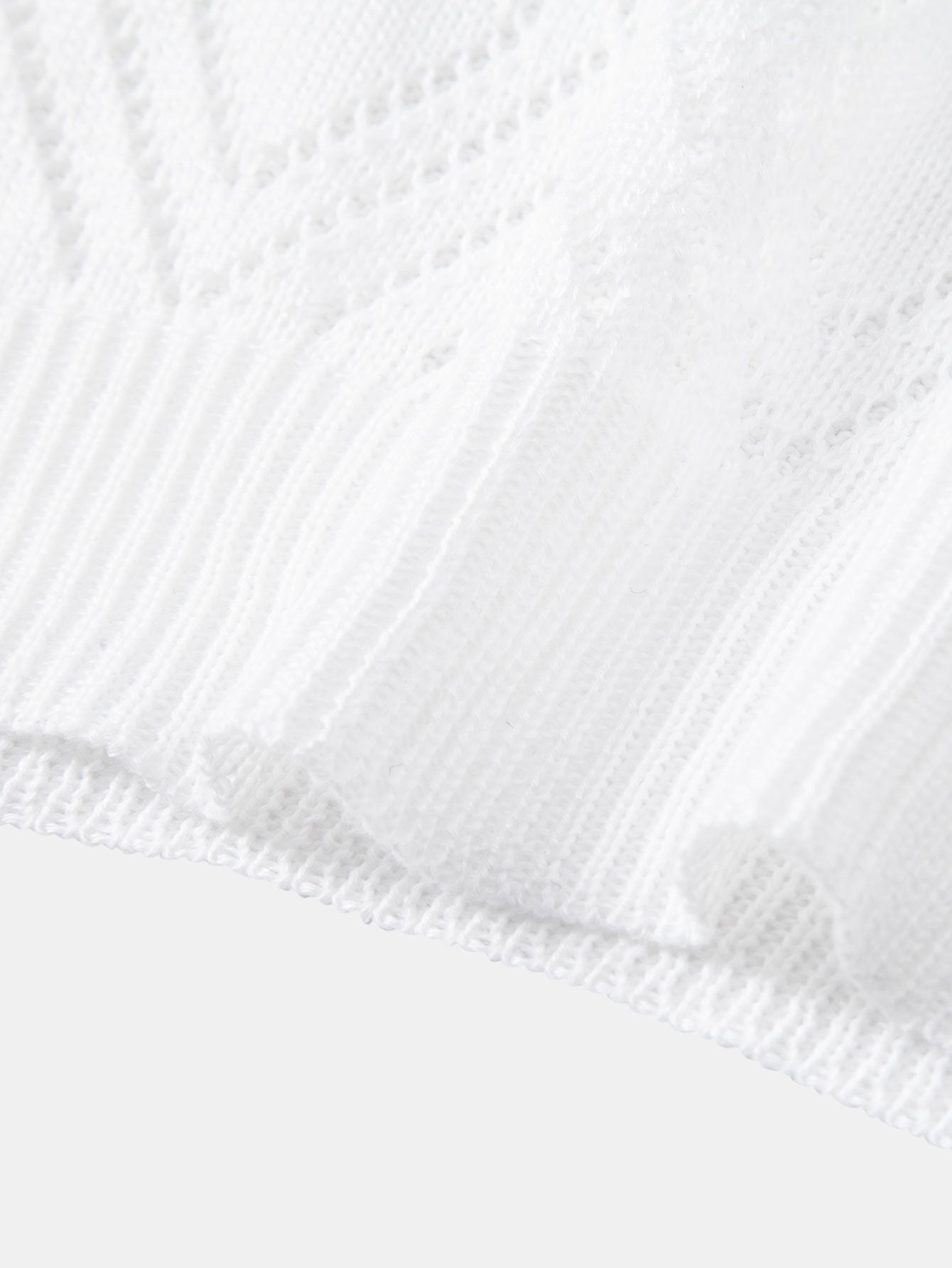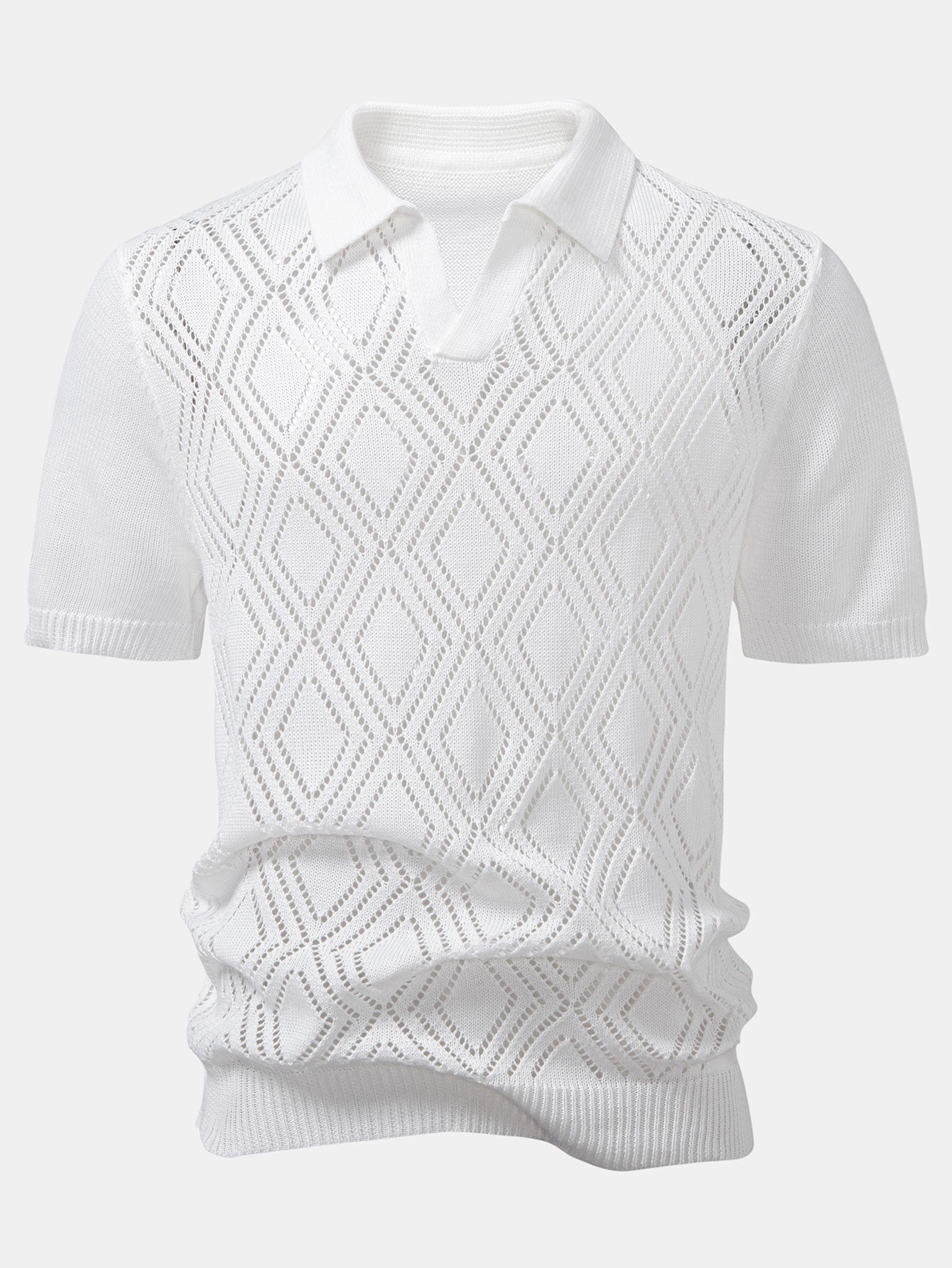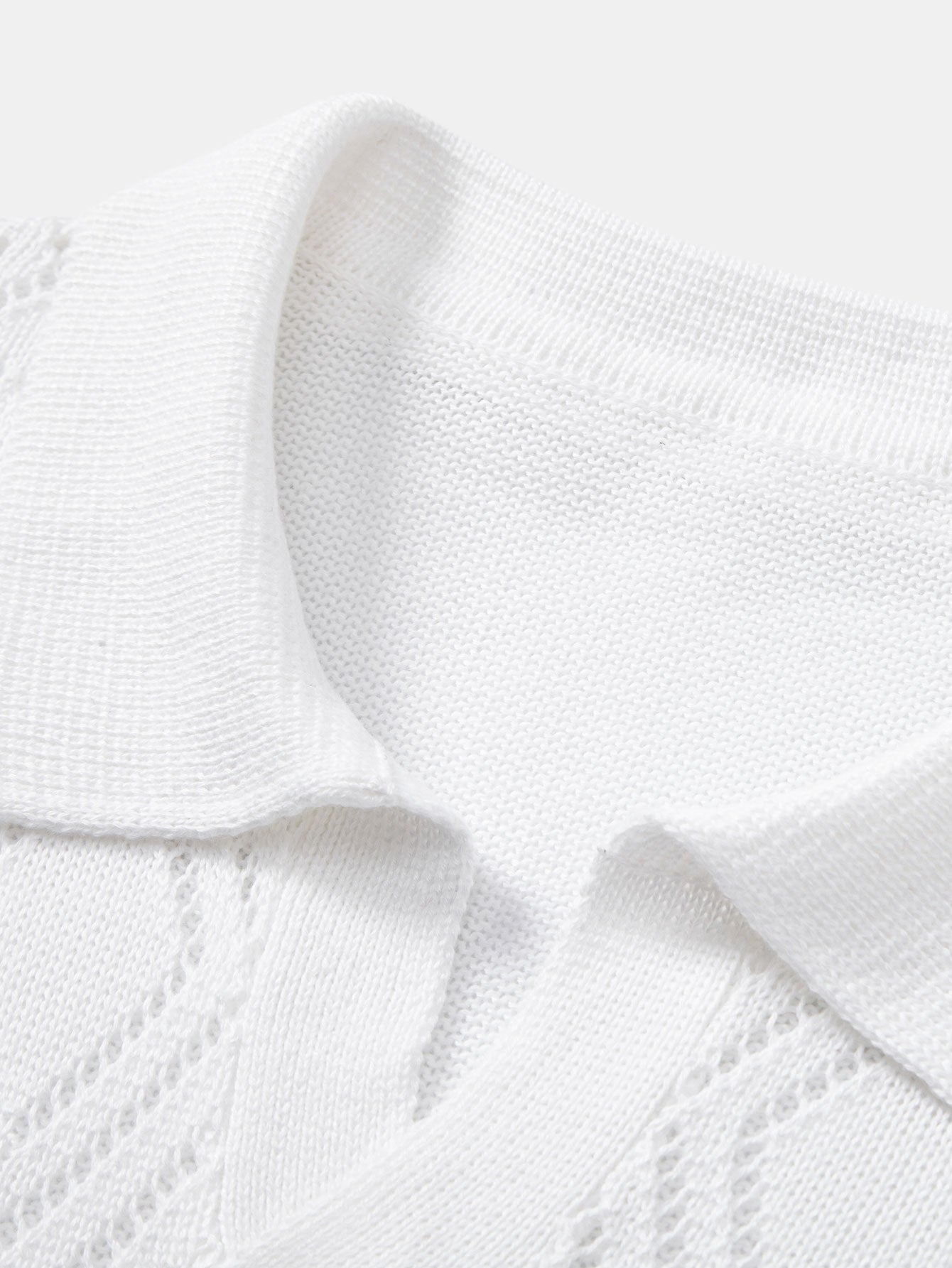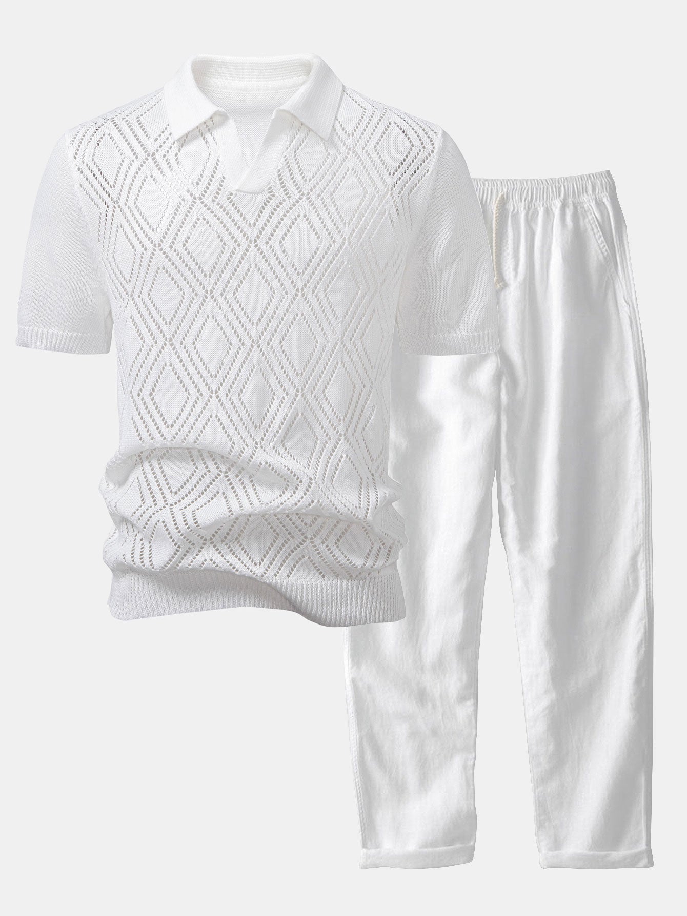 The geometric crochet V-neck polo shirt showcases a bold open-knit design, offering standout texture and ventilation for summer days. Paired with straight-leg linen pants, this look delivers relaxed sophistication with a refined silhouette—perfect for vacation strolls, rooftop gatherings, or everyday style with a twist.
