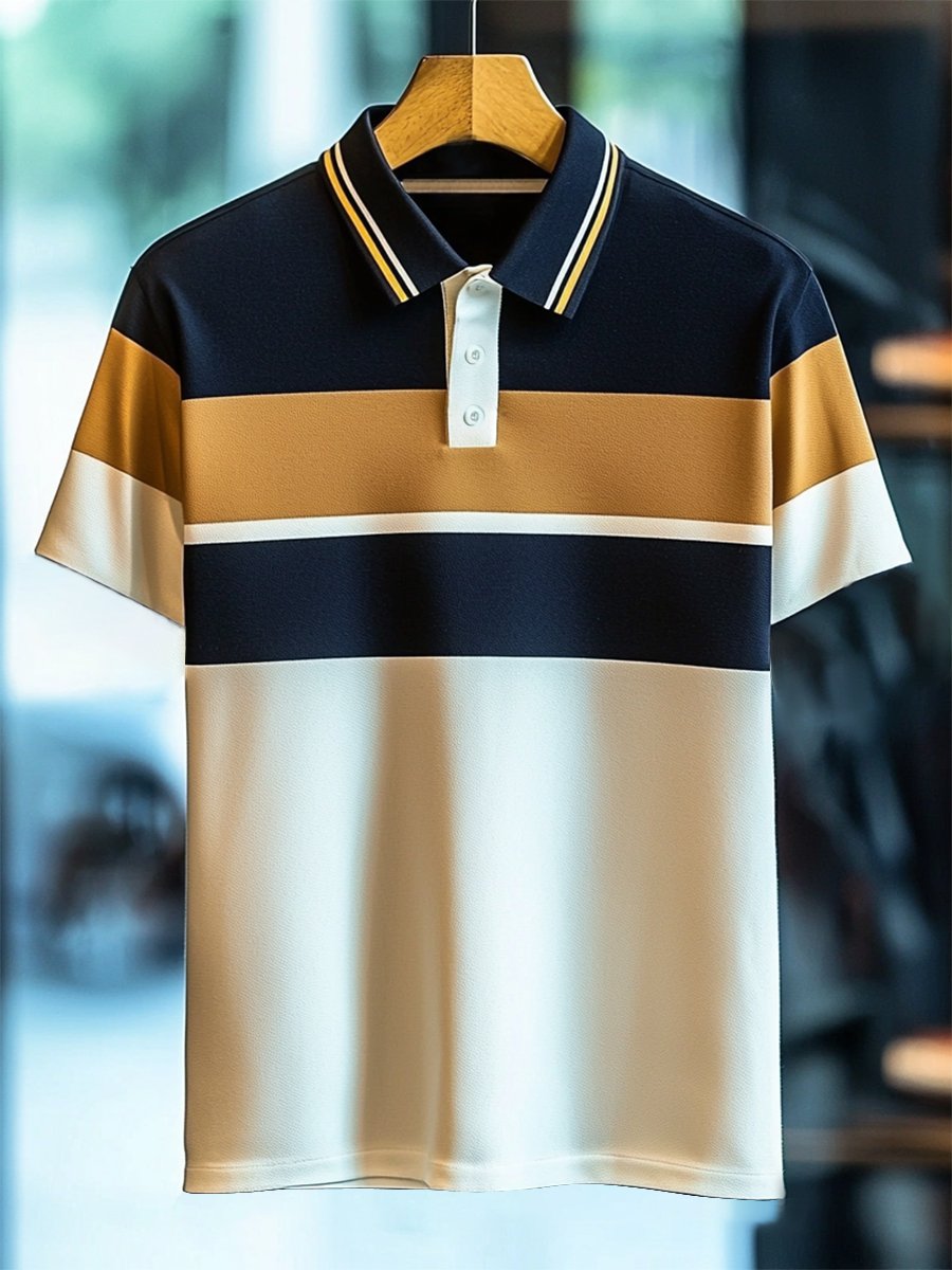 Men's Business Casual Stripe Print Button Short Sleeve Polo Shirt