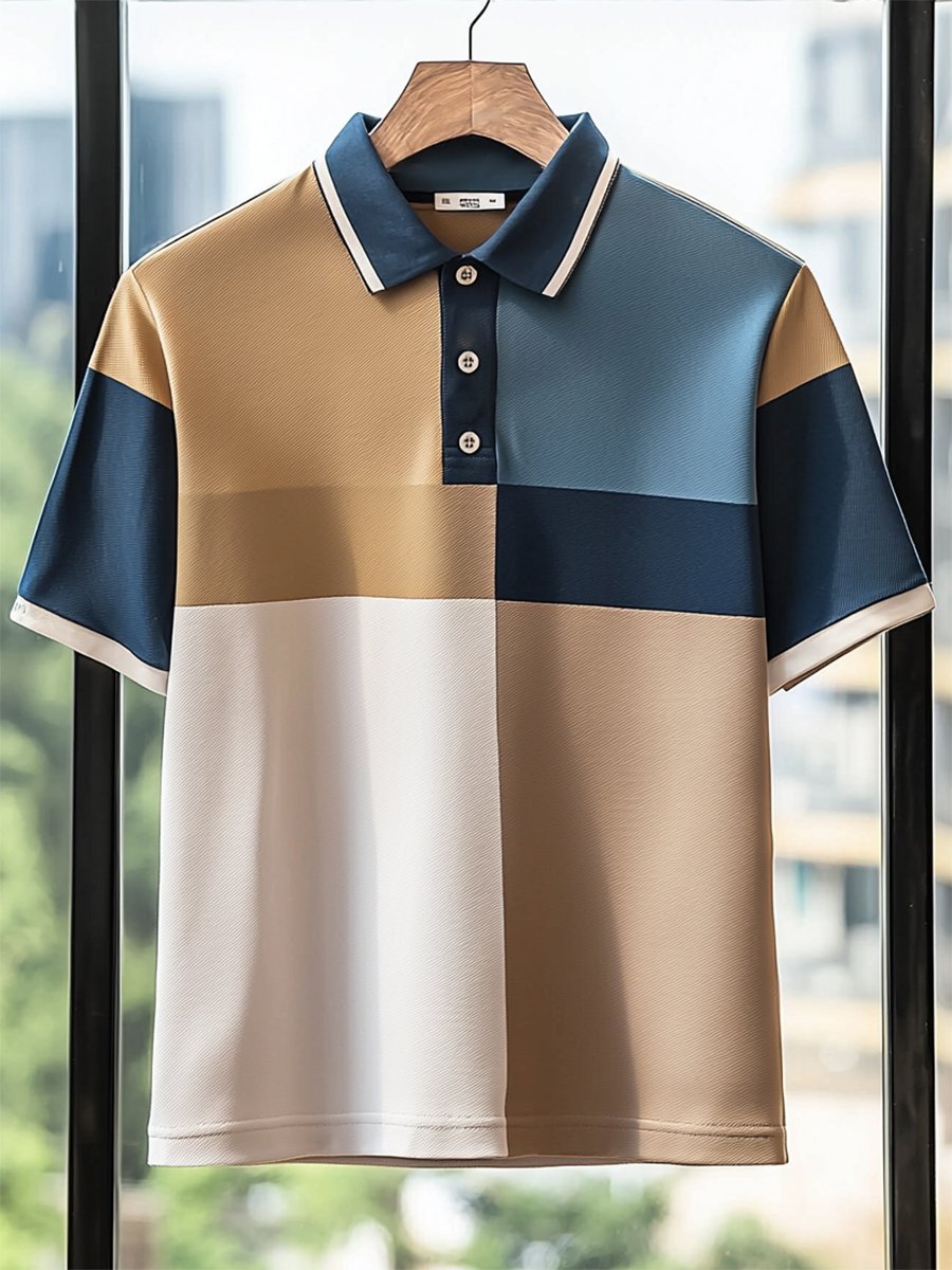 Men's Business Casual Stripe Print Button Short Sleeve Polo Shirt