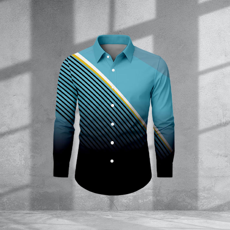 Men's Casual Black & Blue Color Matching Gradien Striped Print Long-Sleeve Shirt