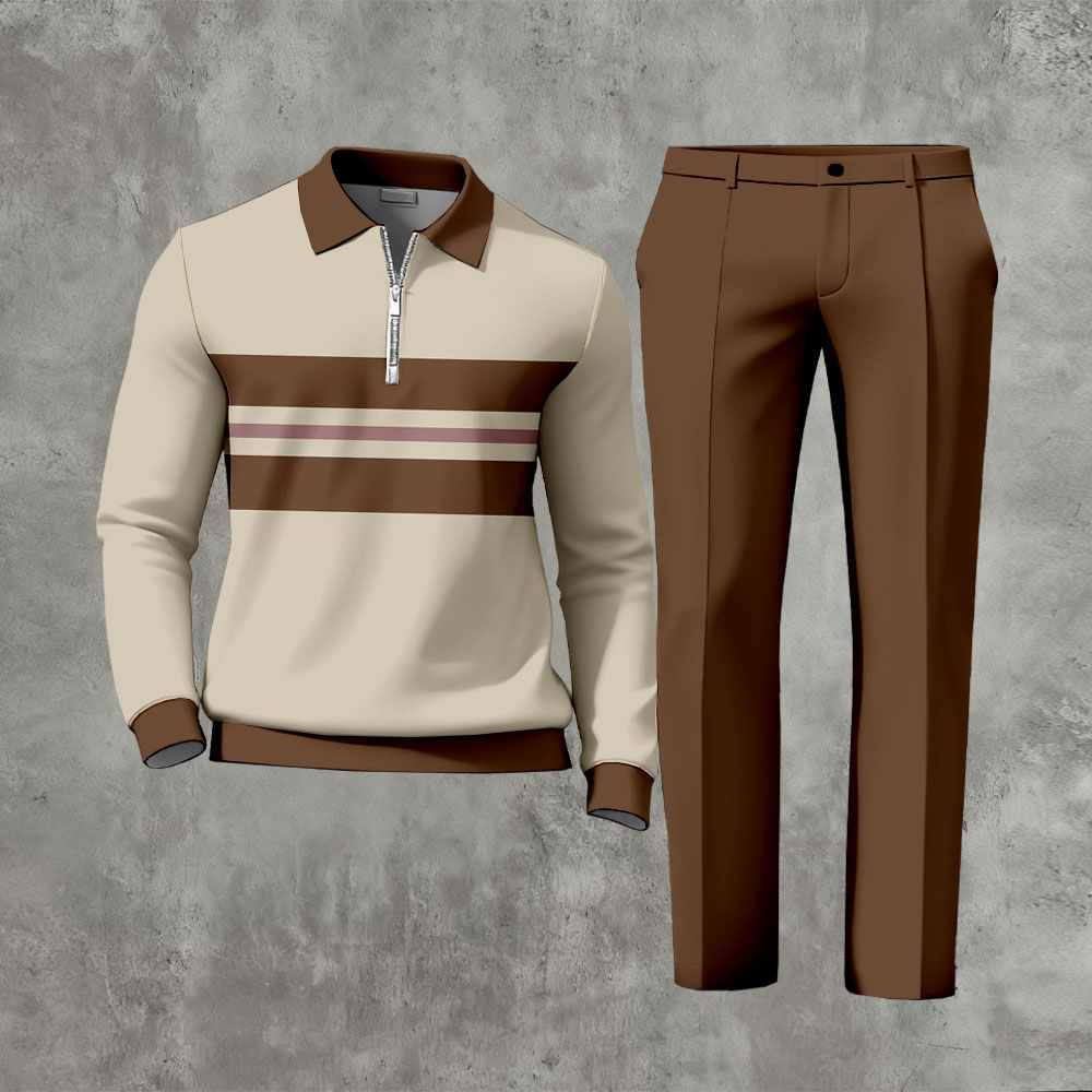 Men's Casual Brown & Khaki Color Matching Printed Zipper Long Sleeved Polo Shirt & Trousers Two-Piece Set