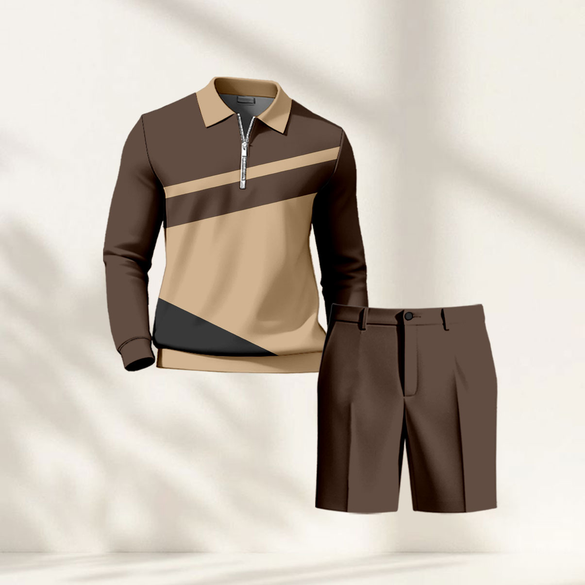 Men's Casual Coffee & Khaki Color Matching Geometric Printed Zipper Long Sleeved Polo Shirt & Five-Point Pants Two-Piece Set