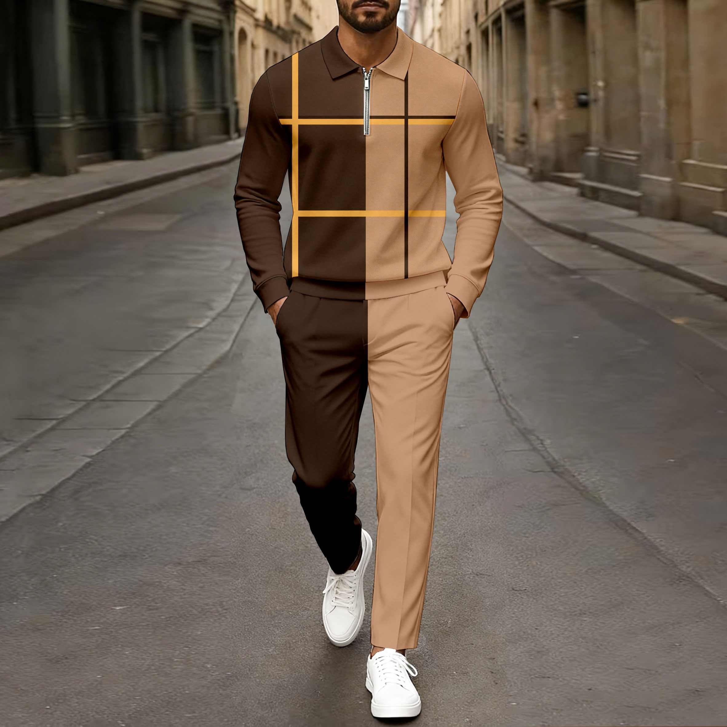 Men's Casual Coffee & Khaki Color Matching Checked Printed Polo-Collar Zipper Long Sleeved Trousers Two-Piece Set
