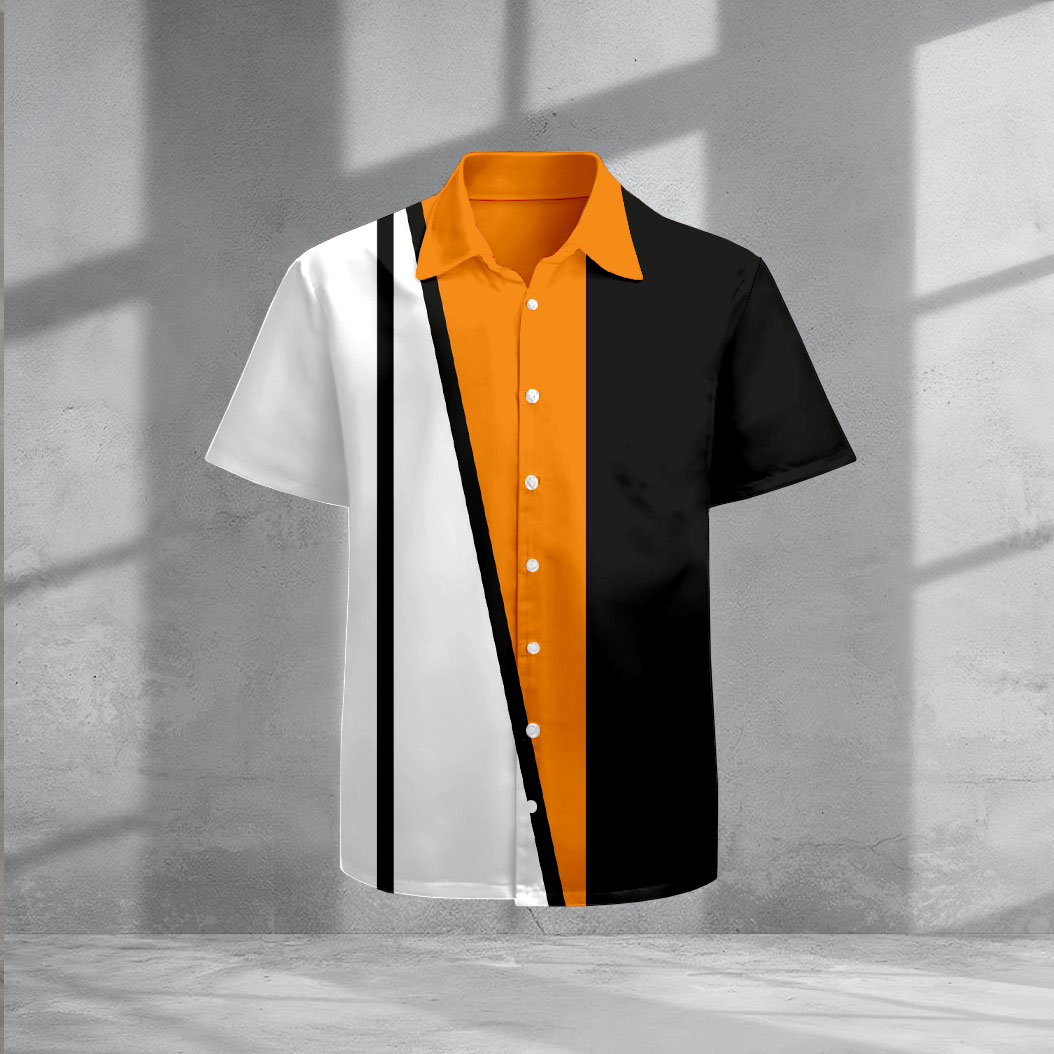 Men's Casual Orangr Black White Color Matching Geometric Print Short-Sleeve Shirt