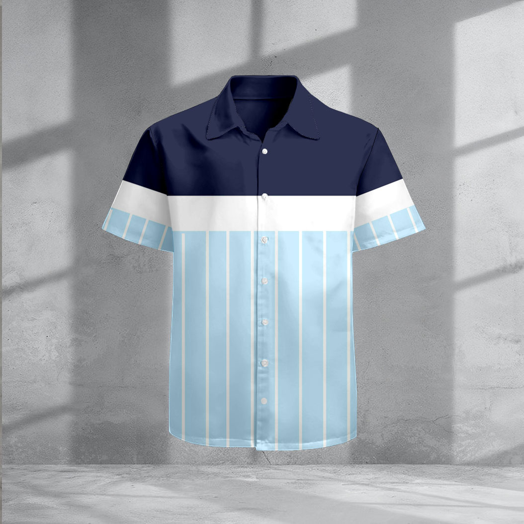 Men's Casual Navy Blue & Light Blue Color Matching Striped Print Short-Sleeve Shirt
