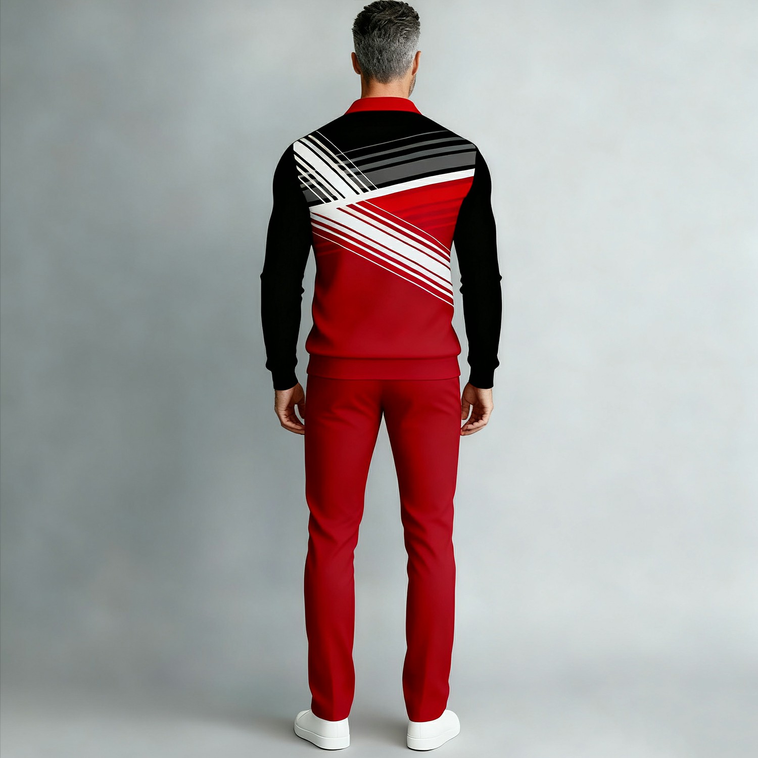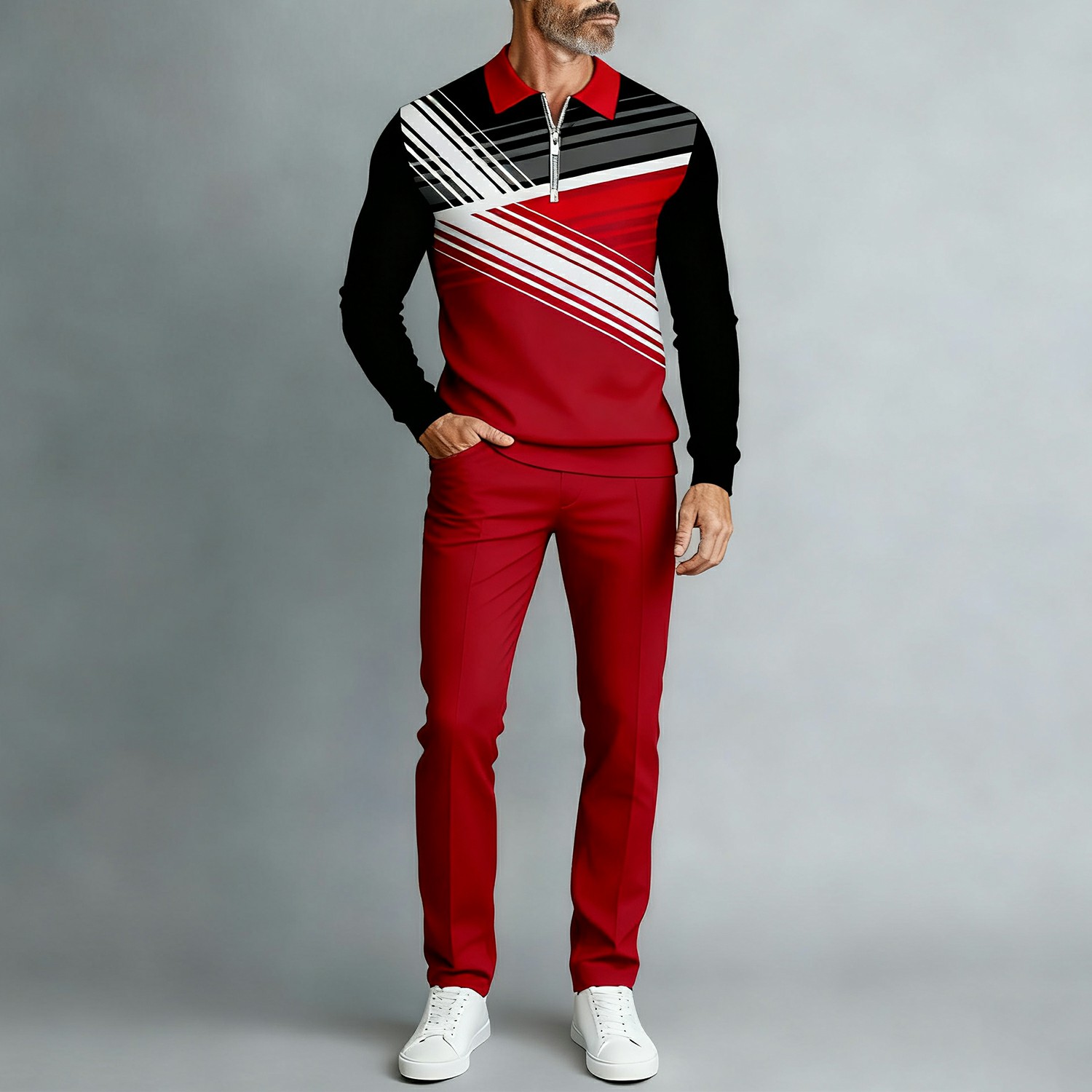 Men's Casual Red & Black Color Matching Striped Printed Polo-Collar Zipper Long Sleeved Trousers Two-Piece Set