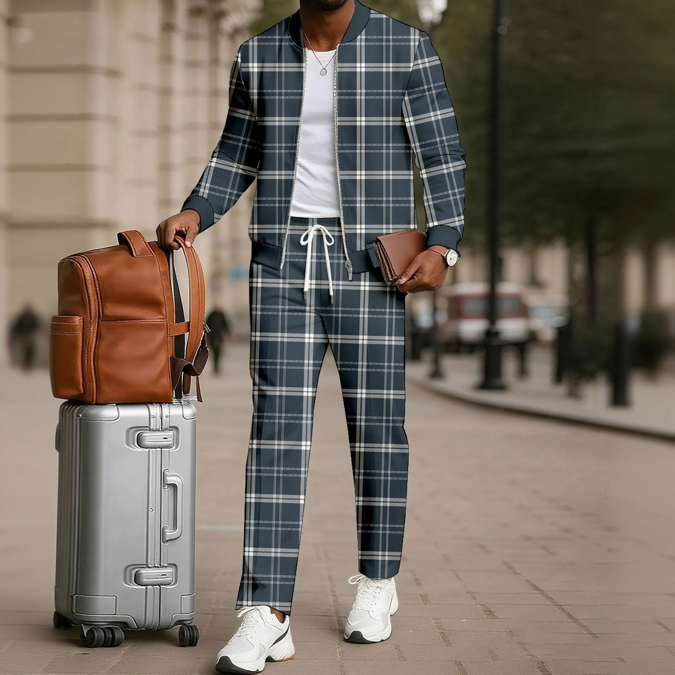 Men's Casual Color Matching Checked Printed Round Neck Long Sleeved Jacket & Trousers Dark Gray Two-Piece Set