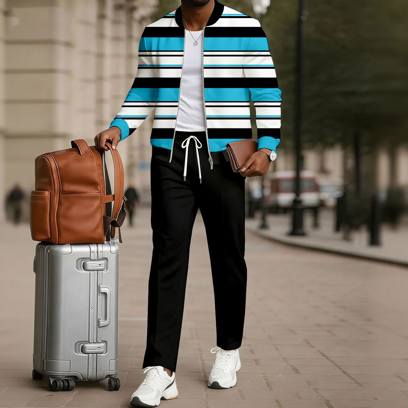 Men's Casual Blue & Black Color Matching Striped Printed Round Neck Long Sleeved Jacket & Trousers Two-Piece Set