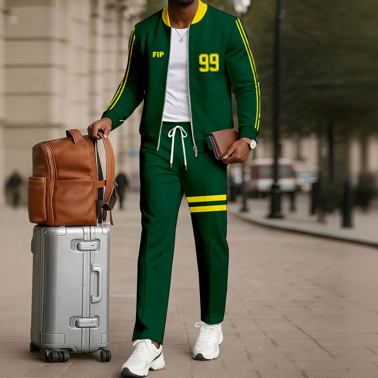 Men's Casual Green & Yellow Color Matching Letter Printed Round Neck Long Sleeved Jacket & Trousers Two-Piece Set