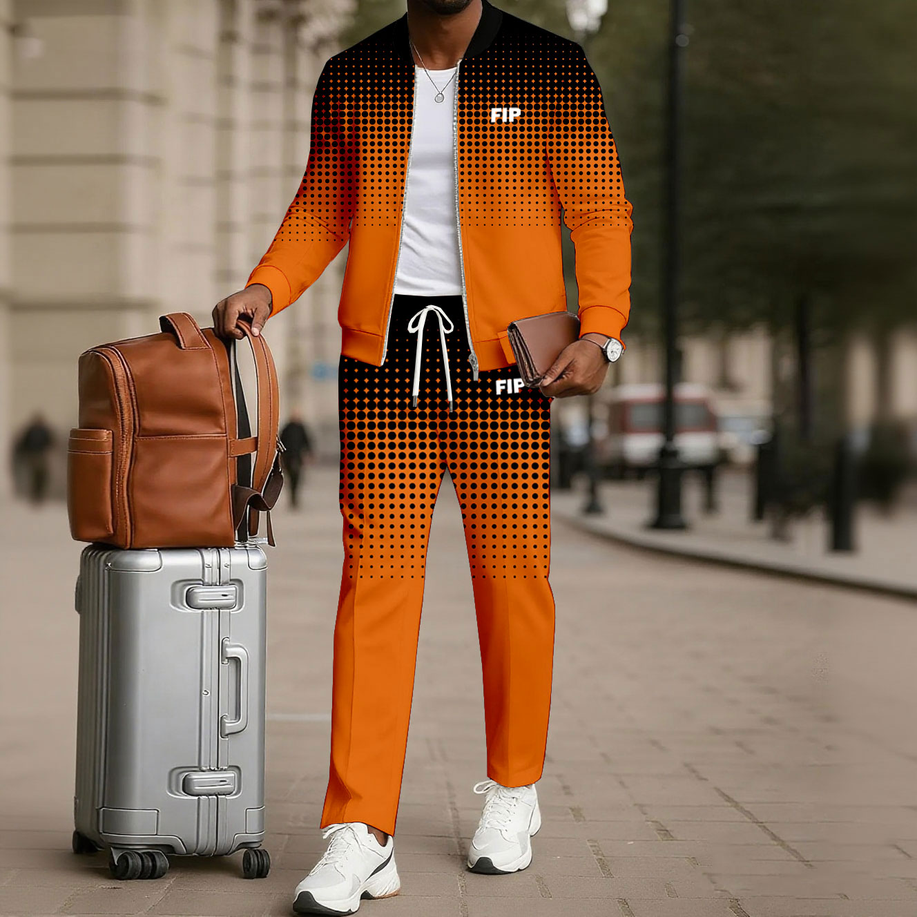 Men's Casual Black & Orange Color Matching Polka-Dots Gradient Printed Round Neck Long Sleeved Jacket & Trousers Two-Piece Set