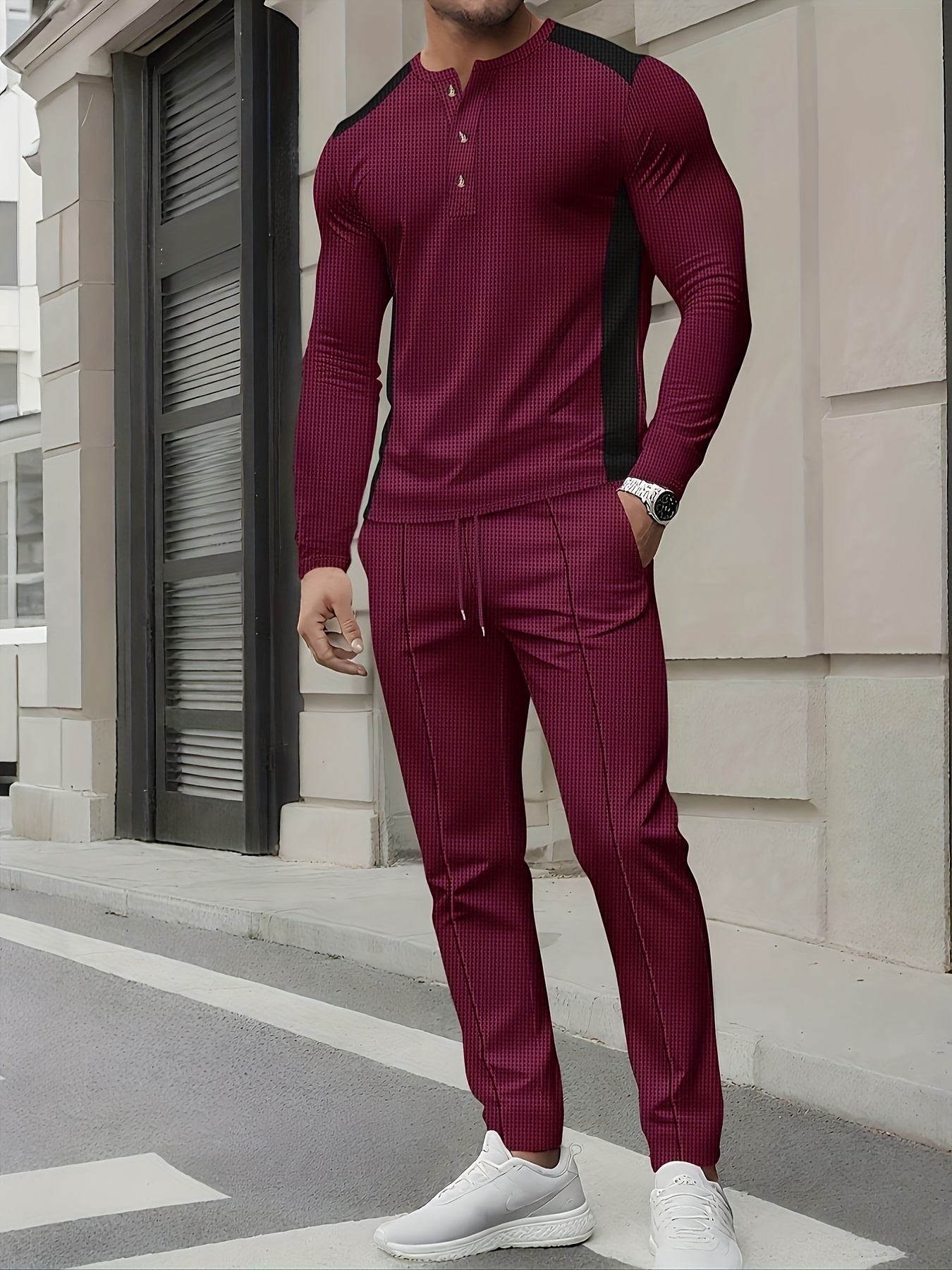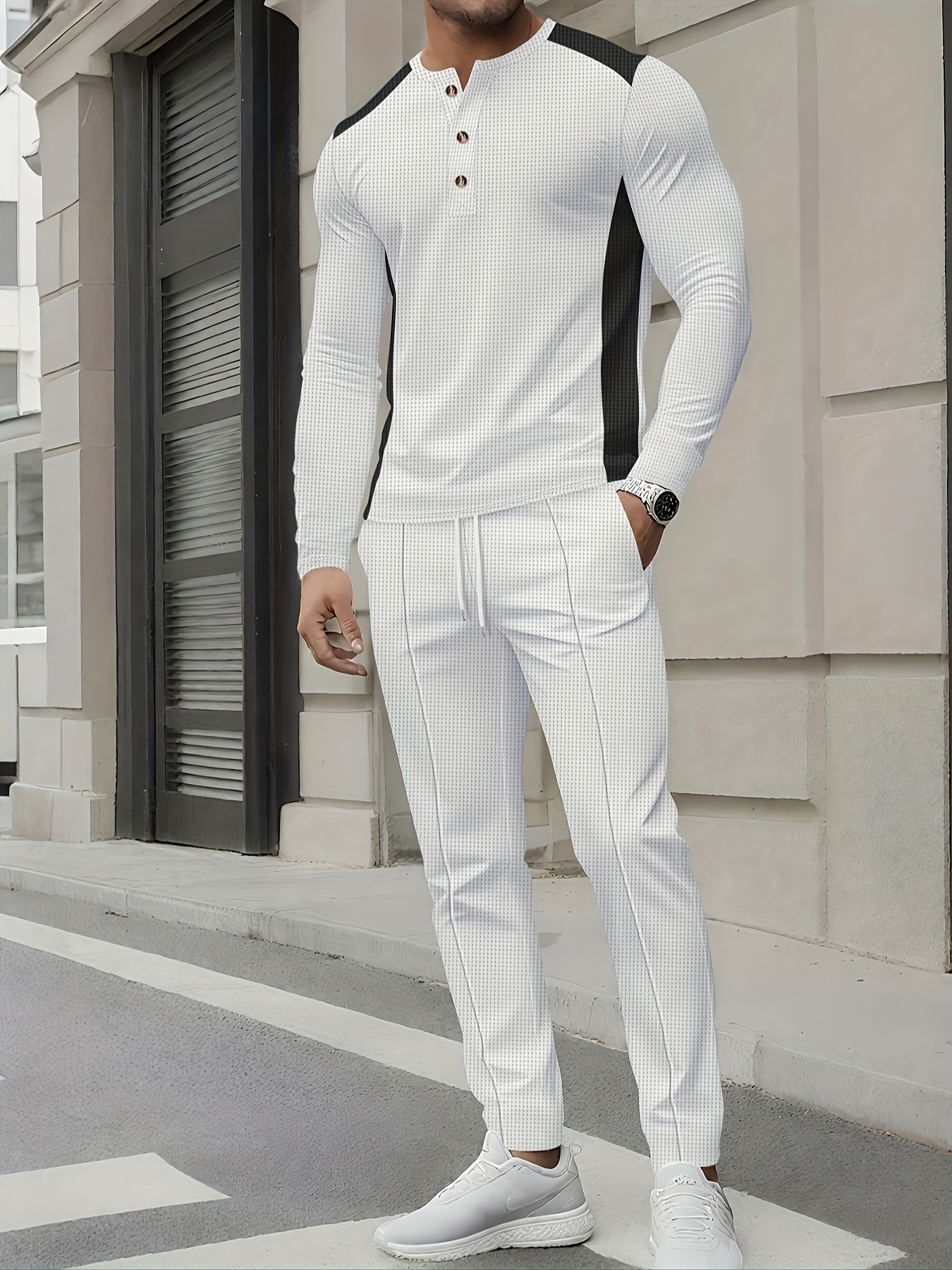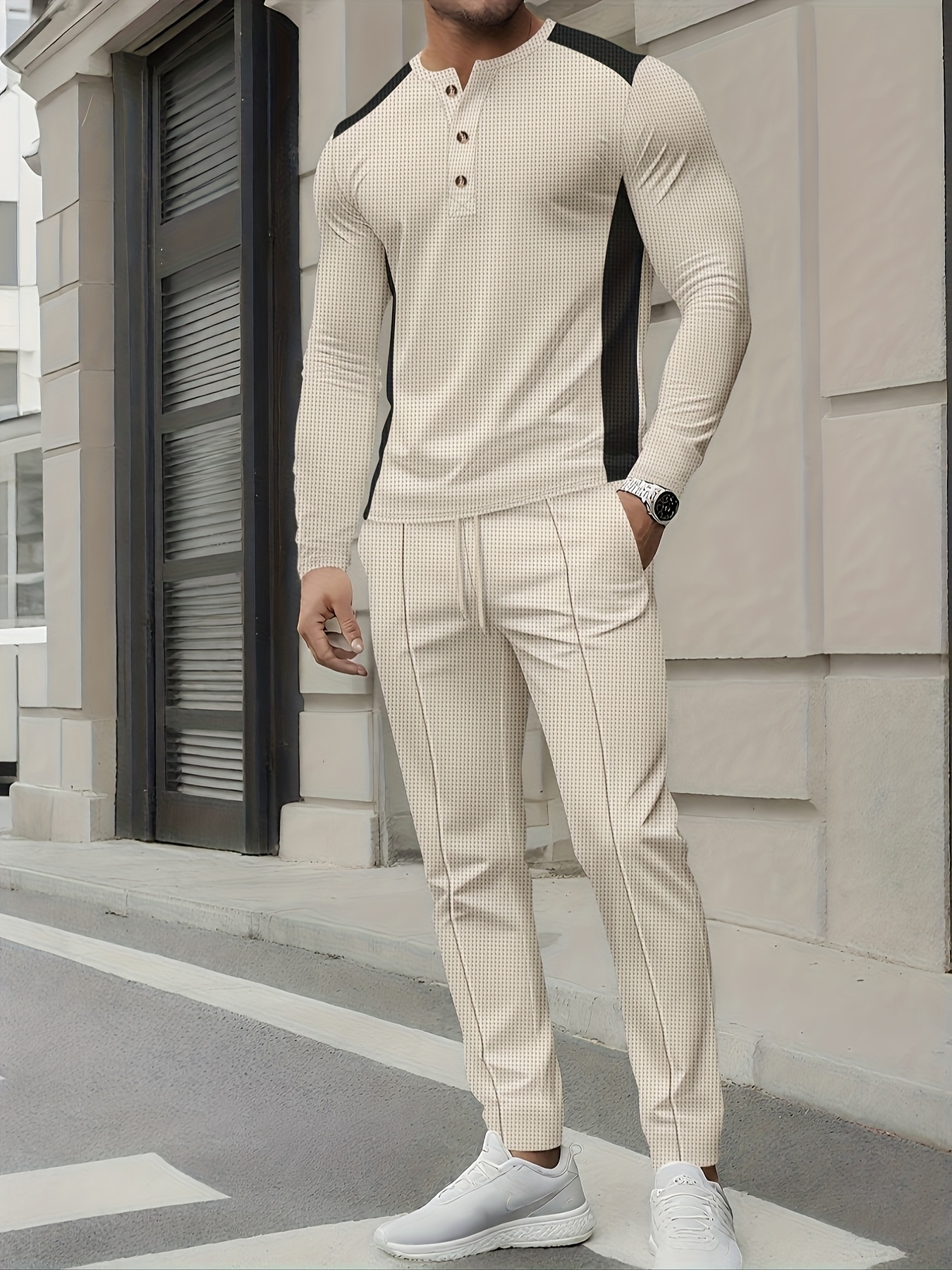 Men's Casual Color Matching Printed Round Neck Long Sleeved Trousers Two-Piece Set