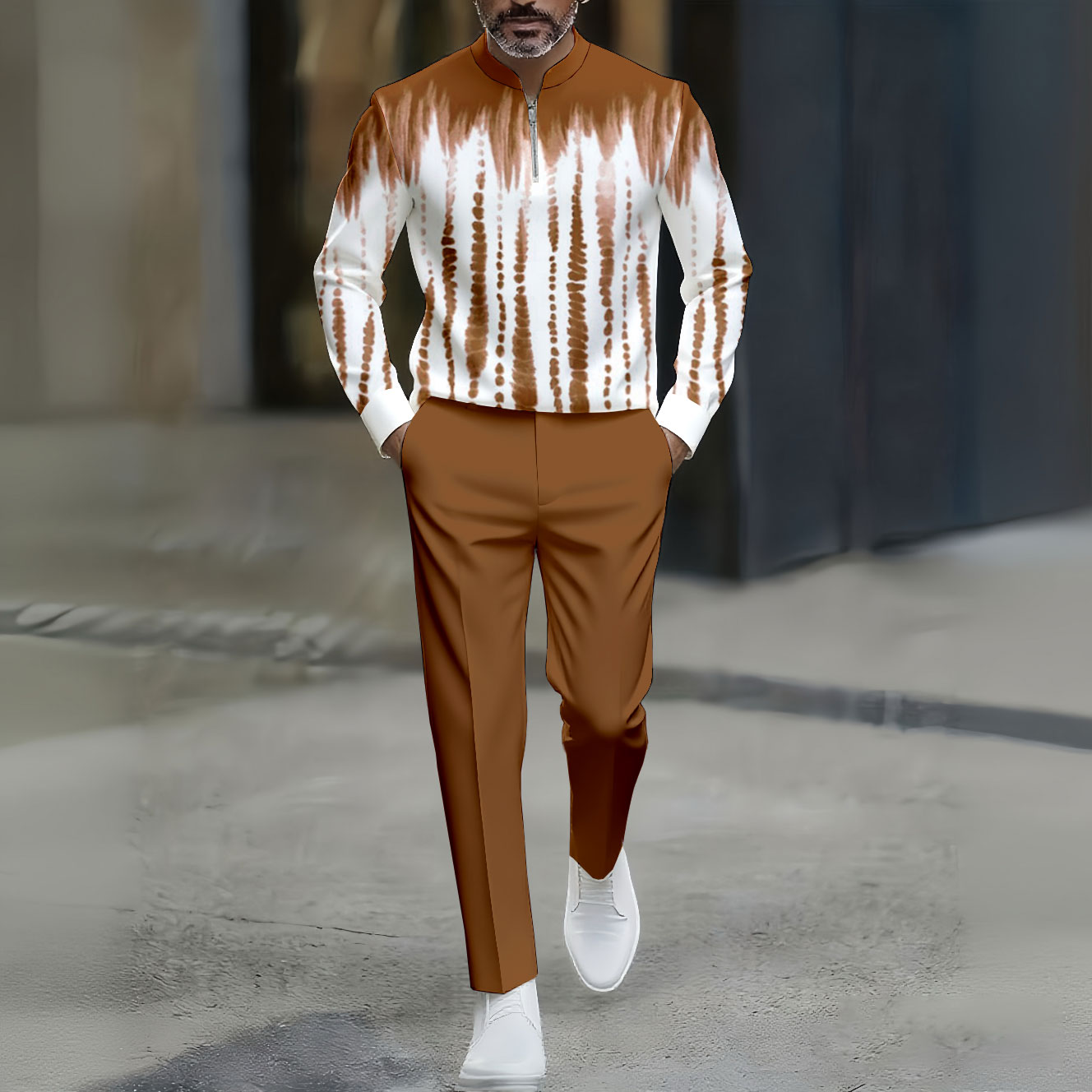 Men's Casual Brown & White Color Matching Tie-dye Printed Round-Neck Zipper Long Sleeved Trousers Two-Piece Set