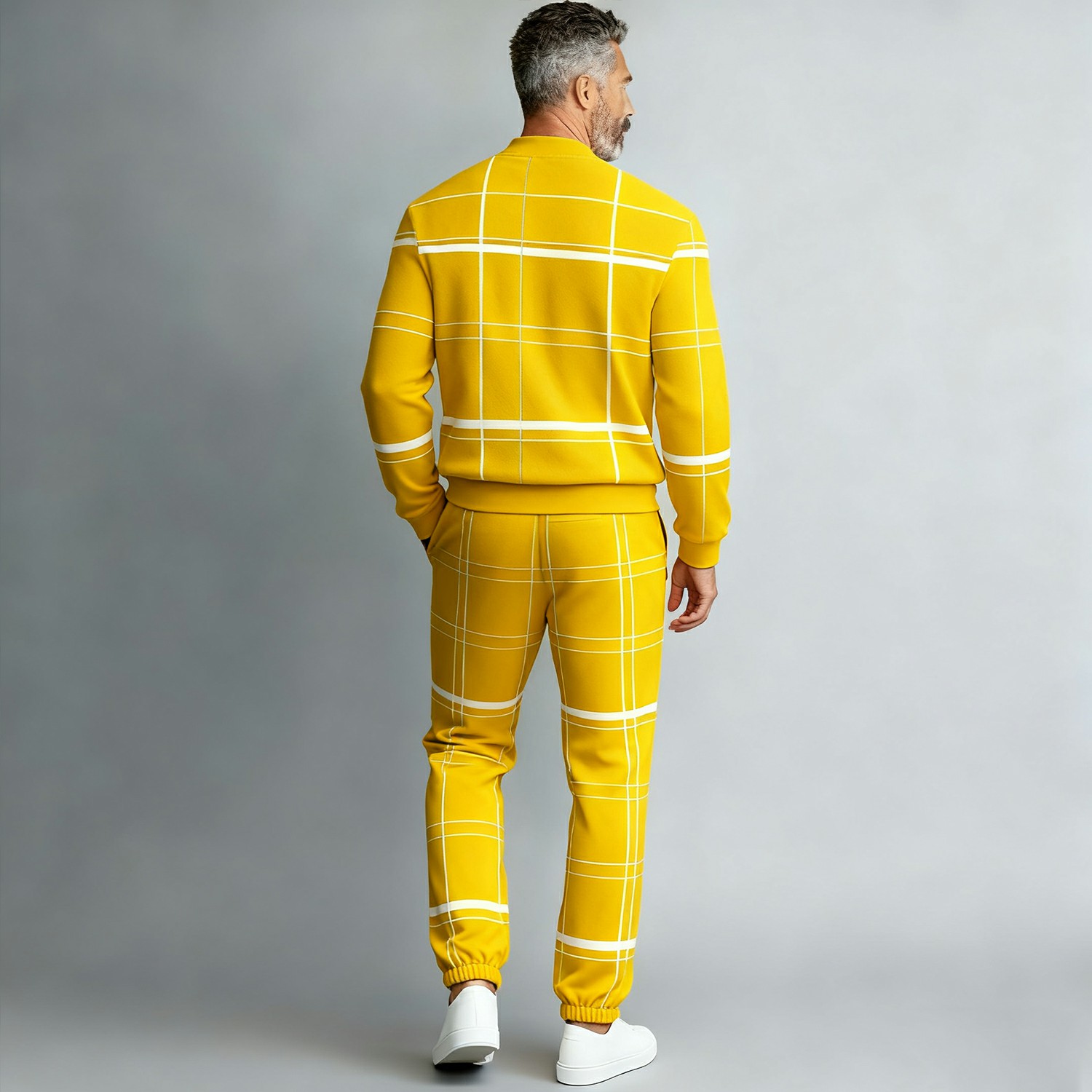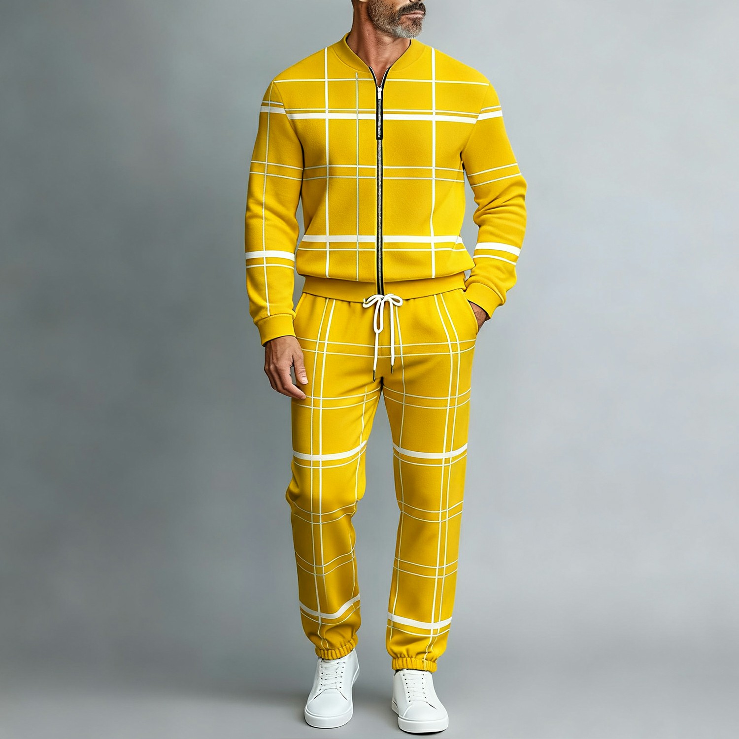 Men's Casual Yellow Color Matching White Striped Checked Printed Round-Neck Zipper Long Sleeved Trousers Two-Piece Set