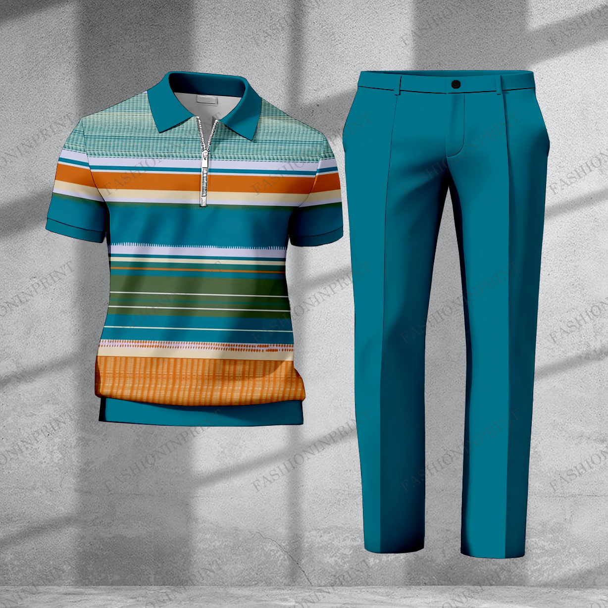 Men's Casual Peacock Blue & Multi Color Matching Striped Printed Short Sleeved Polo Shirt & Trousers Two-Piece Set