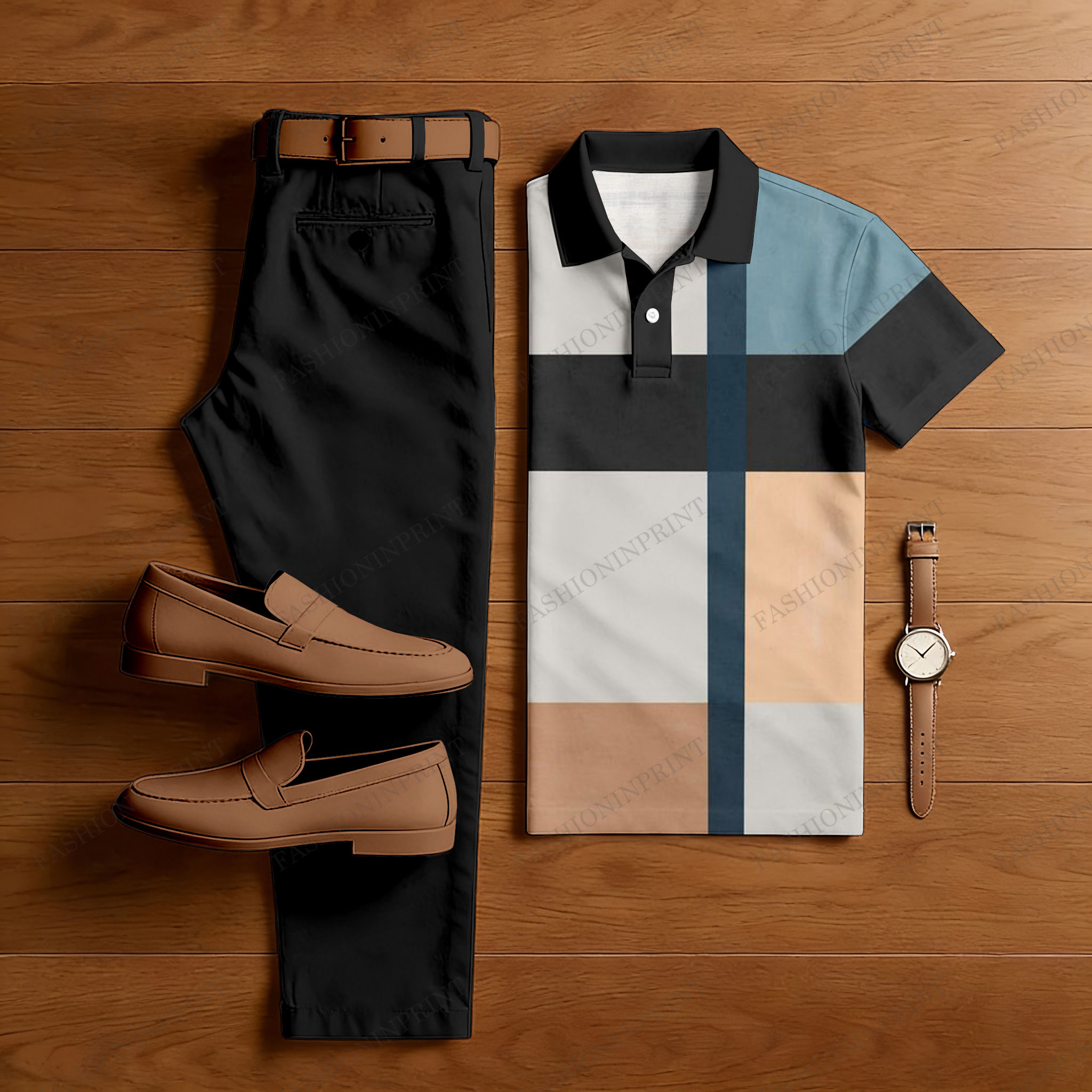 Men's Casual Black & Light Gray Color Matching Printed Short Sleeved Polo Shirt & Black Trousers Two-Piece Set