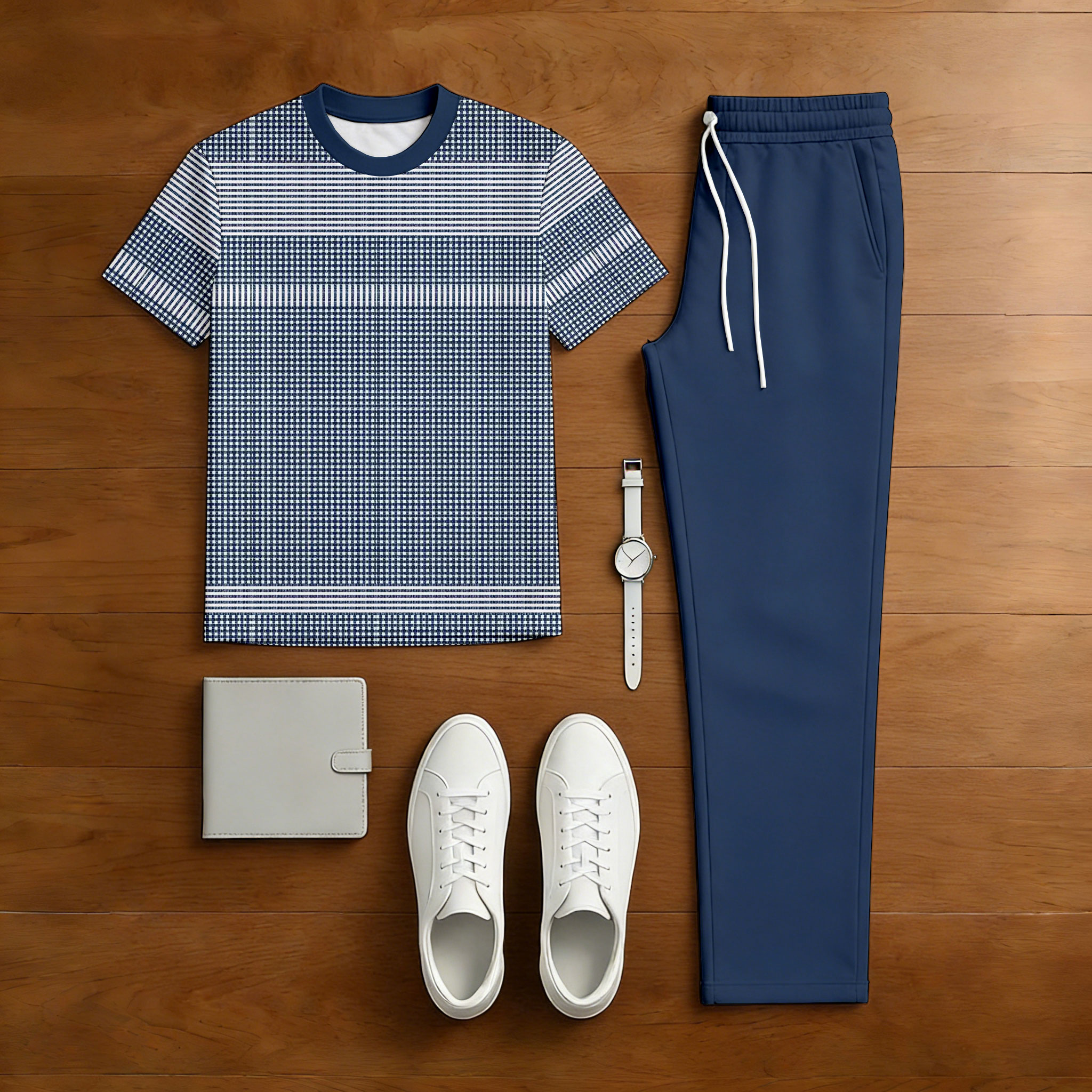 Men's Casual Navy Blue & White Color Matching Checkered Printed Short Sleeved T-Shirt & Trousers Two-Piece Set