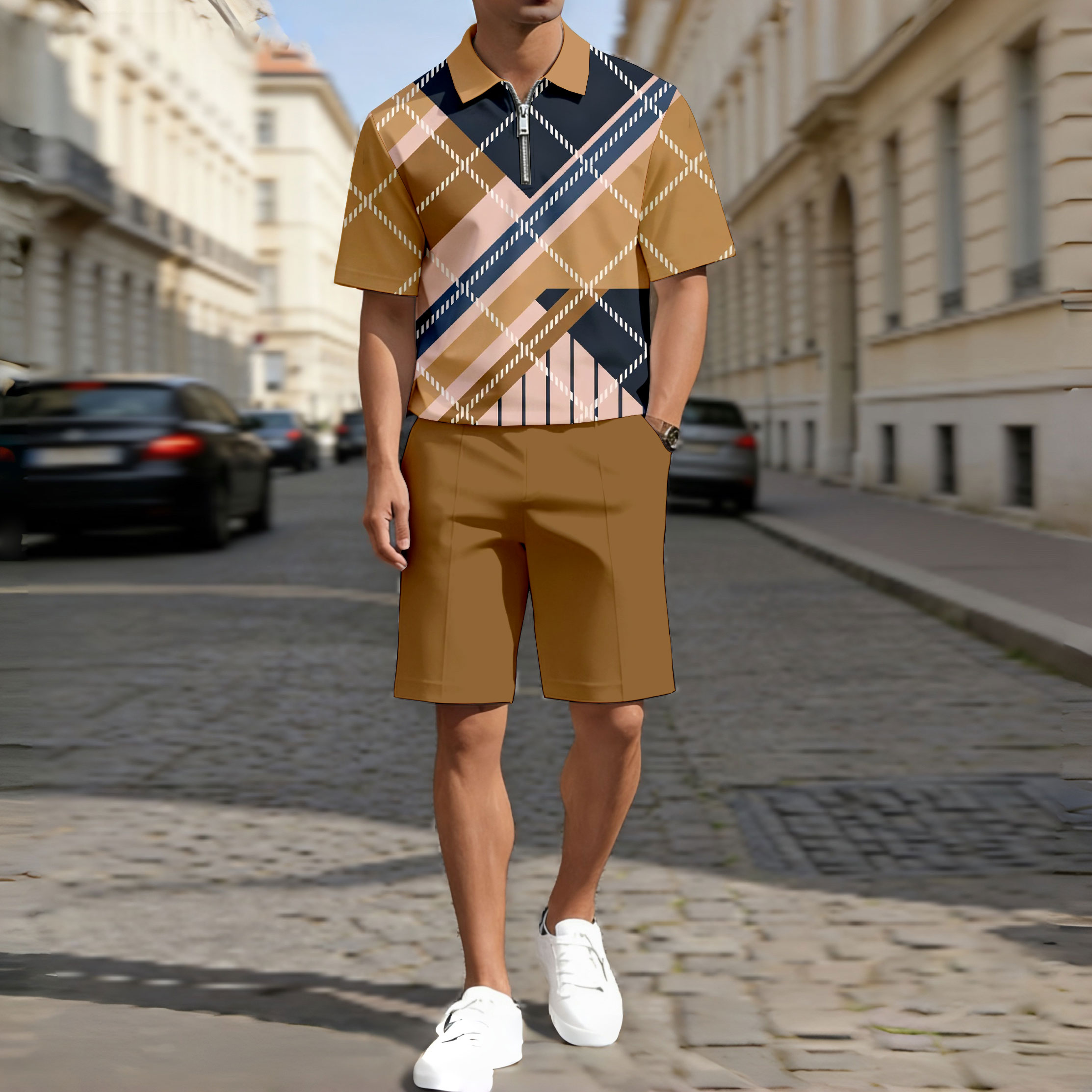 Men's Casual Brown Multi Color Matching Checked Printed Zipper Short Sleeved Polo Shirt & Five-Point Pants Two-Piece Set