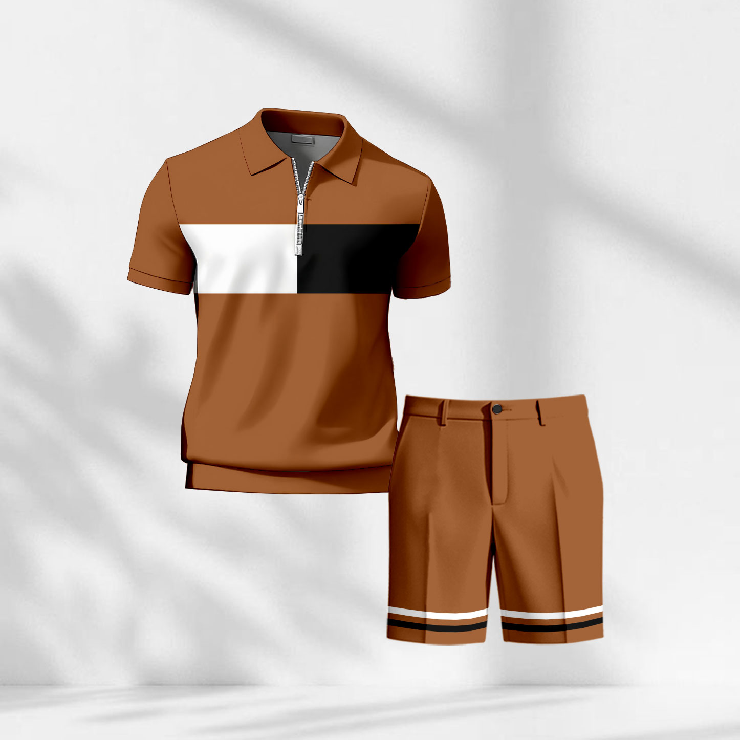 Men's Casual Black & White Color Matching Striped Printed Zipper Short Sleeved Polo Shirt & Shorts Brown Two-Piece Set