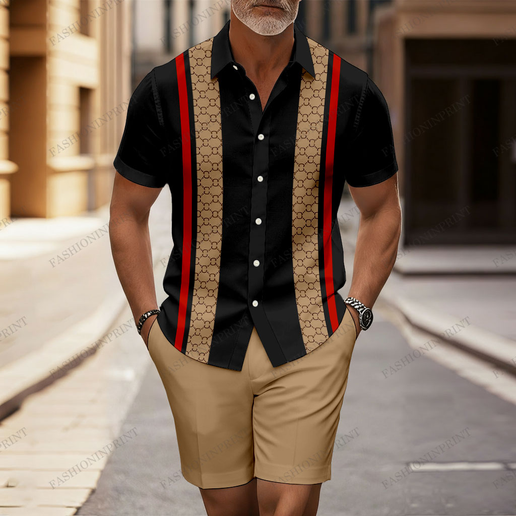 Men's Casual Black & Brown Color Matching Retro Checkered Striped Print Short-Sleeve Shirt & Shorts Two-Piece Set