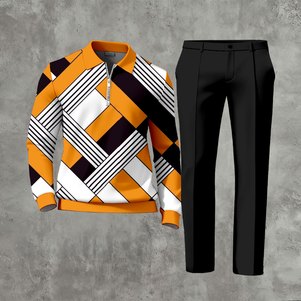 Men's Casual Contrast Color Checked Printed Polo-Collar Zipper Long Sleeved Trousers Two-Piece Set