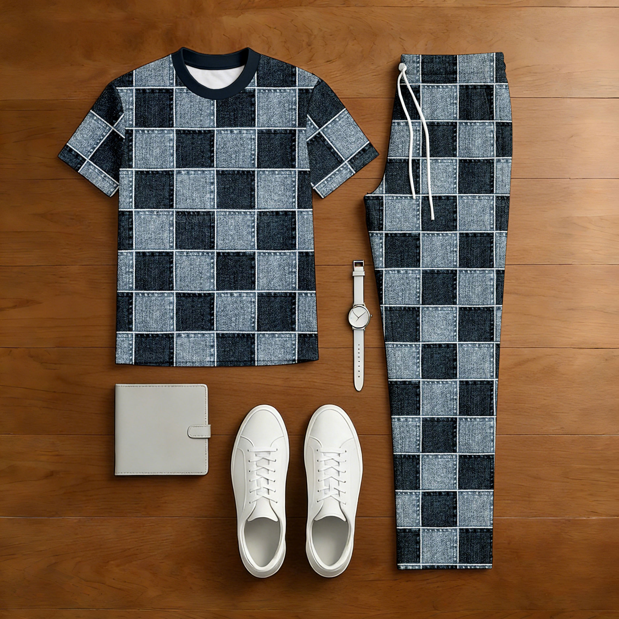 Men's Casual Denim Blue Color Matching Checkered Printed Short Sleeved T-Shirt & Trousers Two-Piece Set