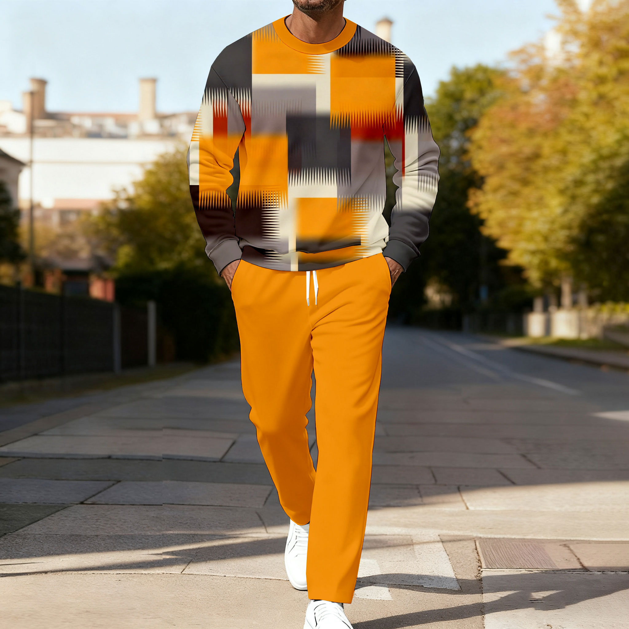Men's Casual Orange & Coffee Color Matching Checked Printed Round Long Sleeved Sweatshirt & Trousers Two-Piece Set