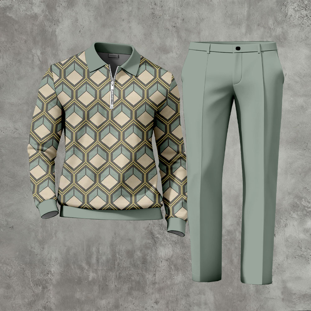 Men's Casual Retro Print Polo Collar Zipper Long Sleeve Pants Two-Piece Set