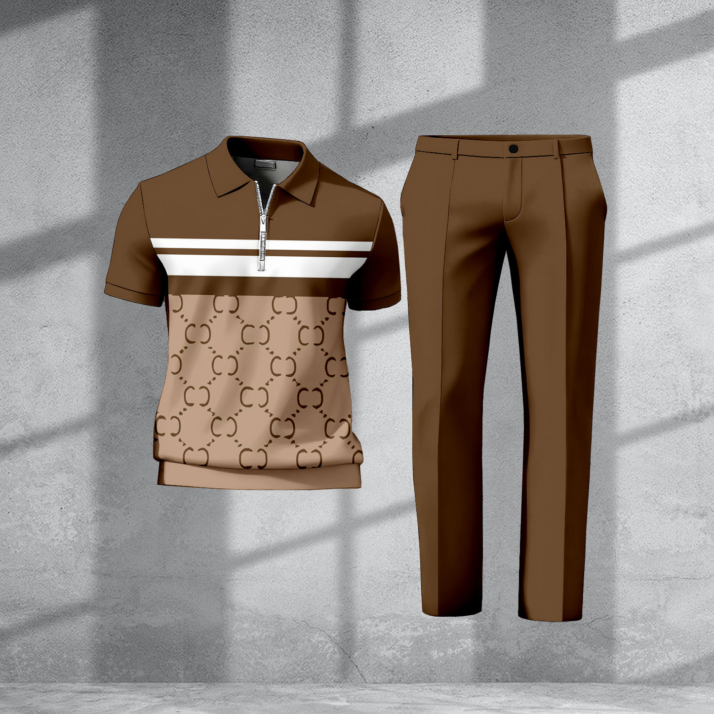 Men's Casual Retro Textured Print Polo Collar Zipper Short-Sleeve Pants Two-Piece Set
