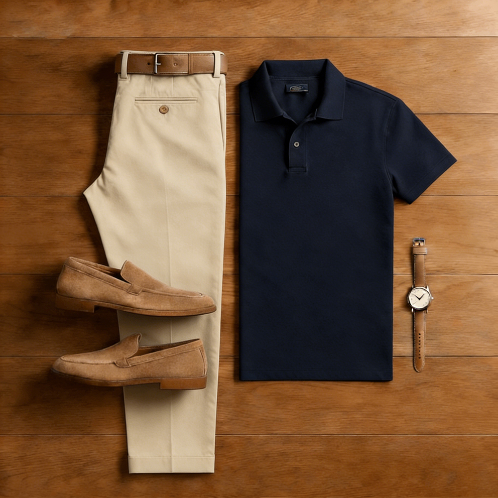 Men's Casual Navy Blue & Khaki Solid Color Matching Short Sleeved Polo Shirt & Trousers Two-Piece Set