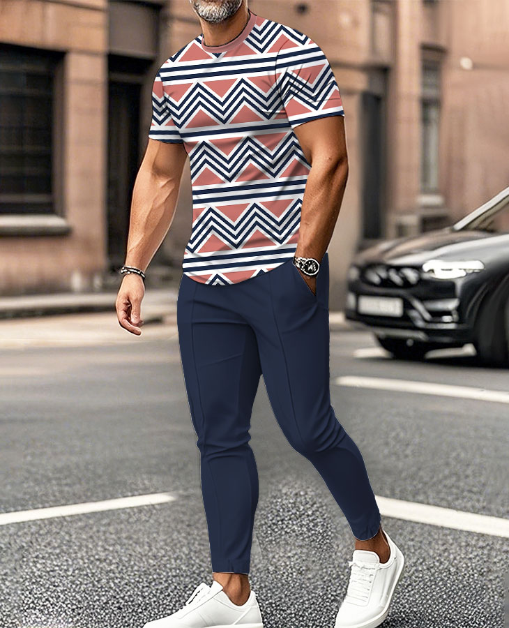 This men's casual two-piece set is the perfect combination of comfort and style, designed for the warmer seasons of spring and summer. Made from a high-quality blend of 100% cotton and polyester, the fabric ensures a soft feel while being breathable and durable for all-day wear. Featuring a bold geometric print, this set offers a unique, modern look that stands out in any casual or sporty setting. The round-neck design and short sleeves provide a relaxed and comfortable fit, ideal for various occasions like casual outings, sports, or weekend get-togethers.