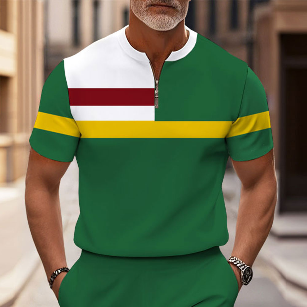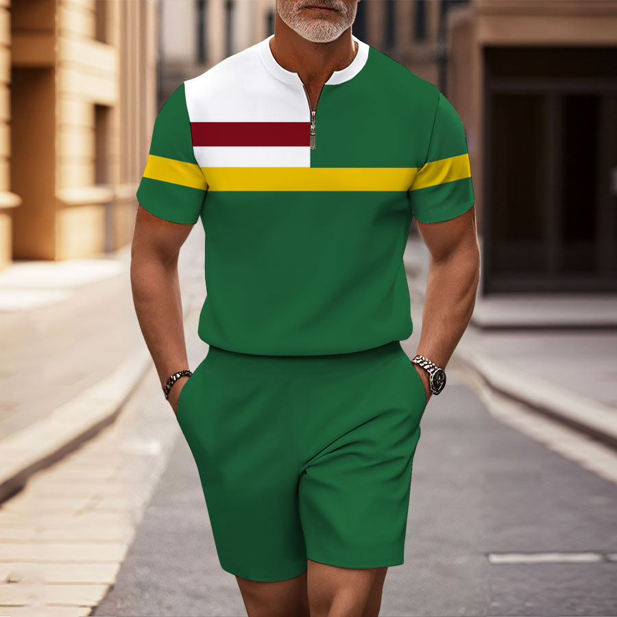 Men's Fashion Casual Green & White Color Matching Geometric Printed Round-Neck Zipper Short-Sleeved Two-Piece Set