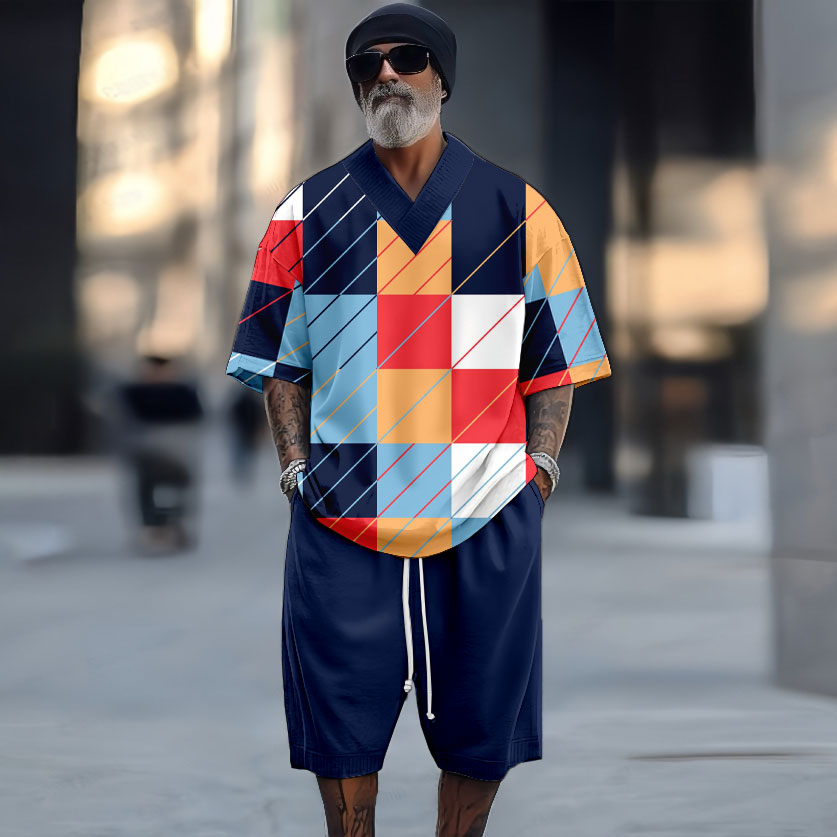 Men's Styles Casual Color Matching Checked Pattern V-Neck Short-Sleeved Two-Piece Set