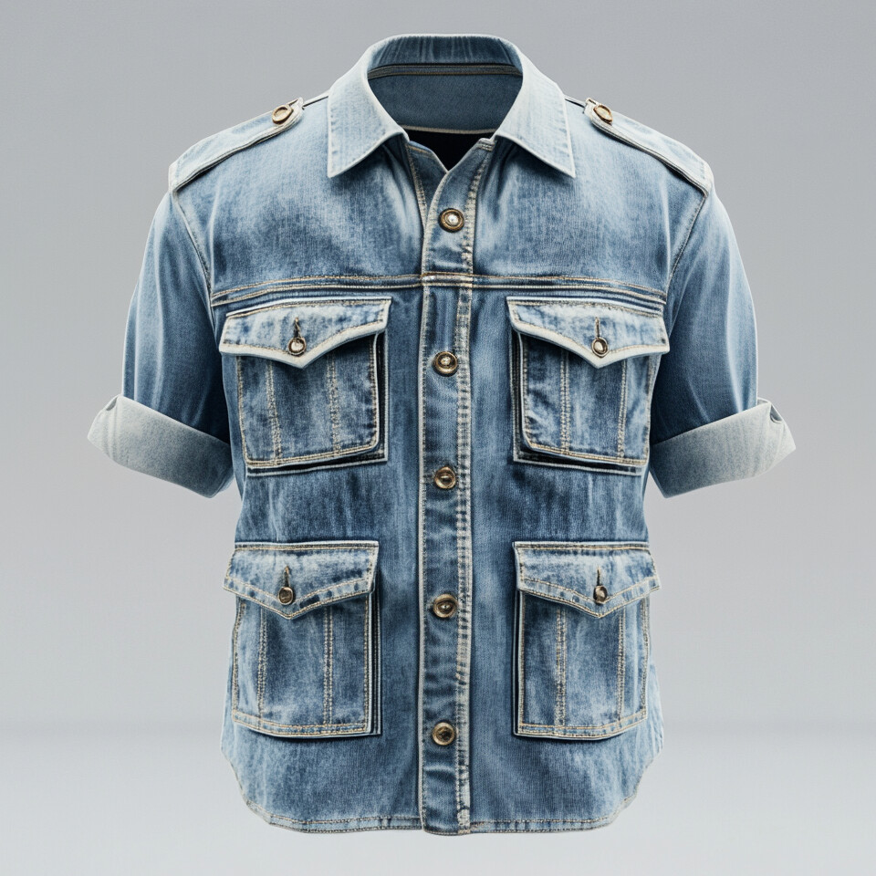 Men's Turndown Collar Long Sleeve Flap Pocket Denim Safari Shirt
