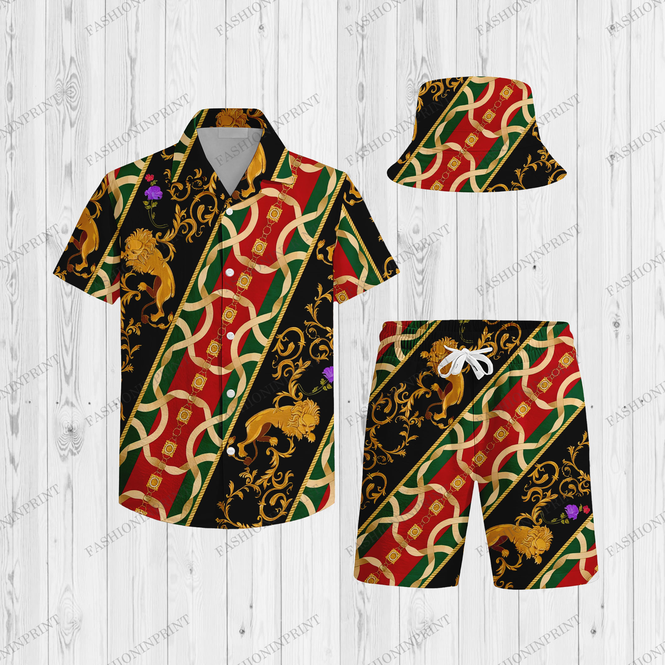 3Pcs Men's Gold Flower & Black Baroque Style Printed Short Sleeves Shirt & Short & Fisherman's Hat